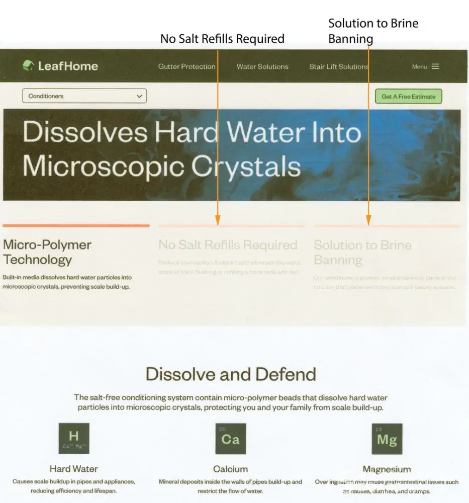 Leaf Home Water Systems sent a 'water expert' to test our water, not the electronic testing they promote. We were sold on a salt-free water filter for our well water, which left us with hard water issues with faucets, coffee pots, satined glassware, and hard water deposits on a brand new deck. Their answer was to revise our system back to a soft water...
