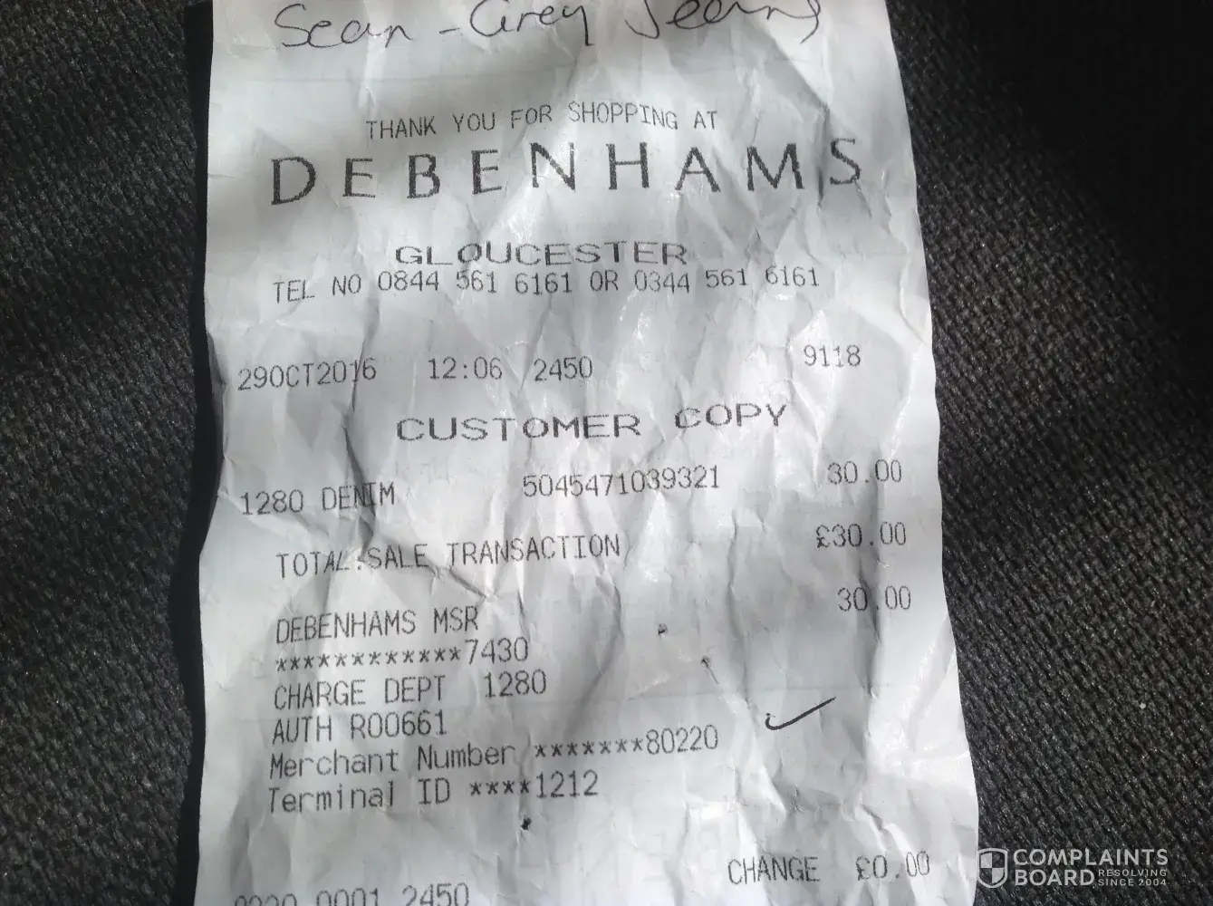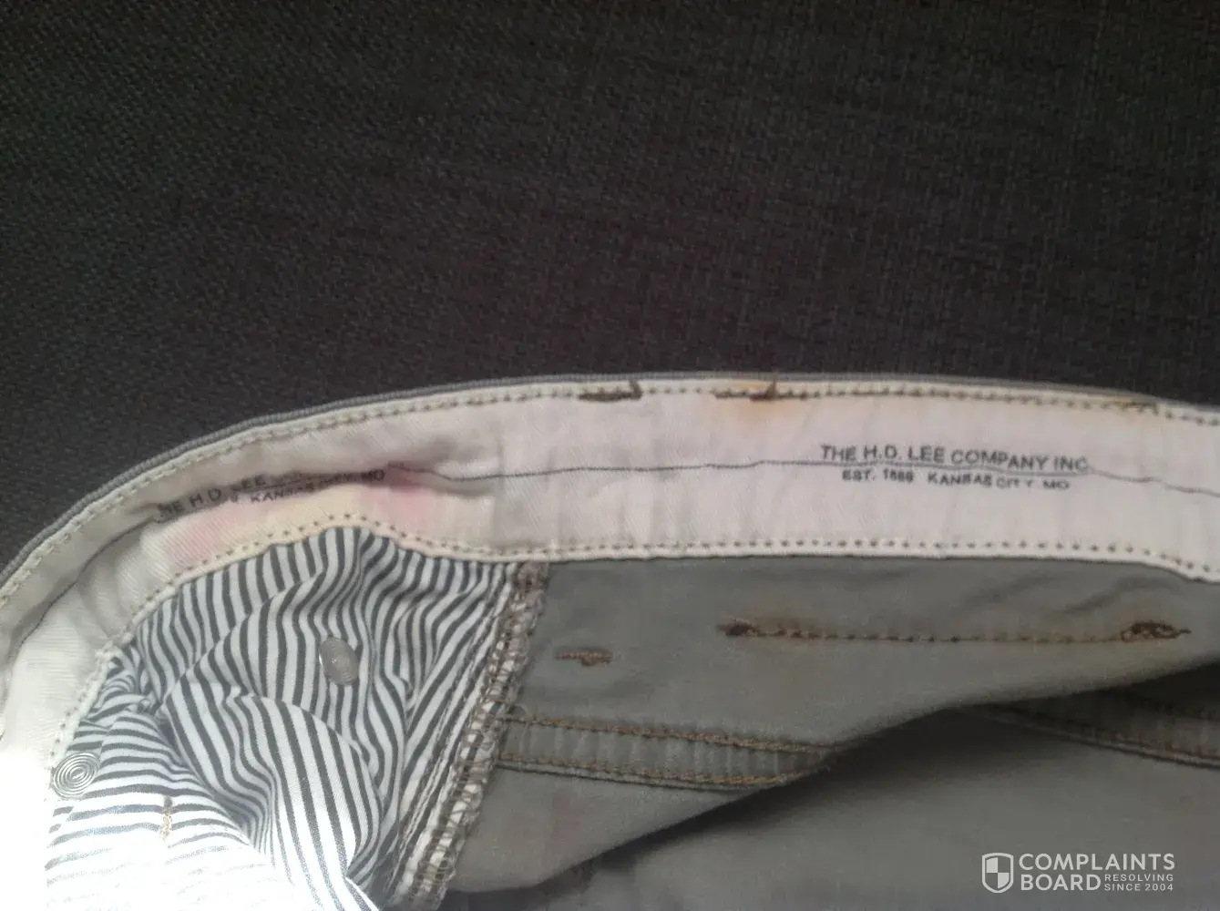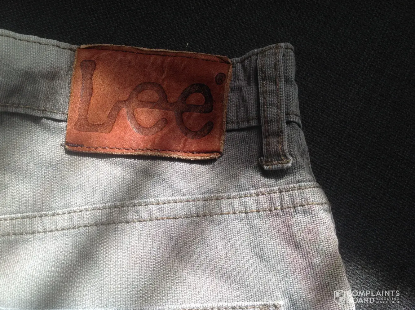 I always purchase Lee branded Jeans for my husband and have never had a problem with the quality before, I purchased him a grey pair of Brooklyn straight leg jeans with serial number on label 441k500. Fc01. They were purchased 29th October 2016 from a Debenhams store in the UK. They seemed to wash ok at first at recommended temperature of 30, but the Lee leather patch on the back seems to be running a brown-red colour onto the jeans. This is the first time this has happened to a pair of his Lee jeans so I think the quality of the leather can not be of a very good quality, I tried to return them to shop but was told as they were purchased over 6 months ago I had better inform you for a solution to this poor quality pair of jeans that can not be worn due to the damage . I would be grateful if you cauldron get back to me a.s.a.p. I enclose a photos of the reciept and damage caused.