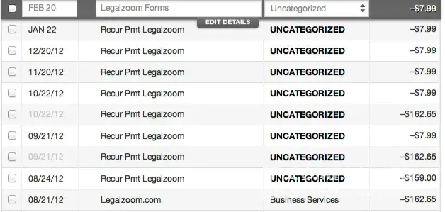 Since registering a Trademark with Legalzoom, I have been getting hit with a $29.99 charge every month on the 13th since 2011. The description for the transactions are "services." I am a fairly cautious buyer and I KNOW I would not have signed up for something that is indefinitely recurring. The answer from Legalzoom will be something along the lines of "you must be getting charged for a service you were unaware you signed up for."