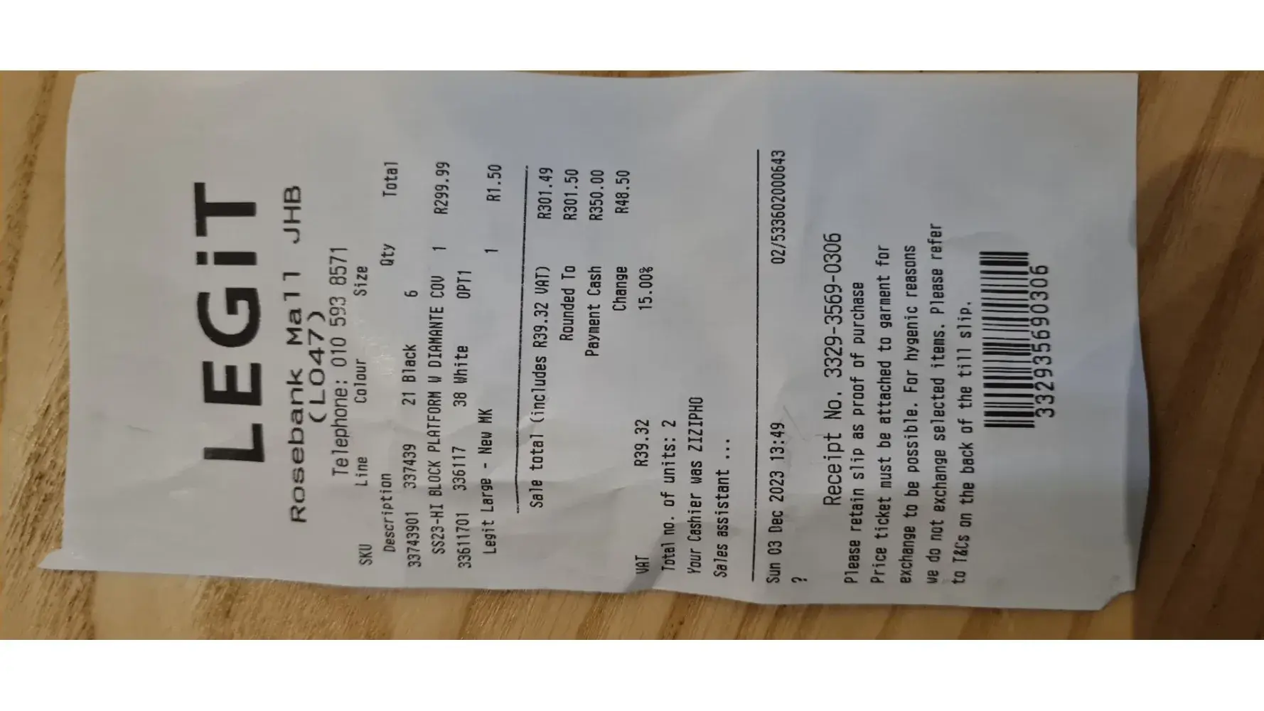 Shoes bought on the 3rd December 2023 in Rosebank mall