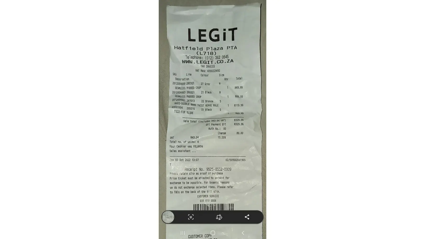 I had such an ordeal experience yesterday when i went to do an exchange on two items of which had price tags on them and a purchase slip ...did I not spend 30 min standing while the two Cashiers where busy scrutinizing the items and called the mannanger to also give an opinion on one item of which they felt it has been worn. And only telling me that 30min of me standing waiting to do the exchange as I had already picked other items to exchange with. I then asked what is going on I need to go I am still at work myself what is taking so long. Only then they found the decency to tell me they can only allow exchange for 1 of the items I had bought and not the other as she feels it's been worn. When I asked what makes her think that/what proof does she have,she just said "it's her opinion' the way she see's it" ok that's it? I was completely astonished by this.never have I ever had a problem with exchange..I was so upset I just left the store and even left the clothing item I had bought forward for exchange which was worth more then R200. Without a proper explanation to why they can't exchange it.no refund no exchangewas done...I'm so disappointed in the service and I dought I'll even go to that shop again.after all Legit is my favourite store but after yesterday I ain't so sure anymore.