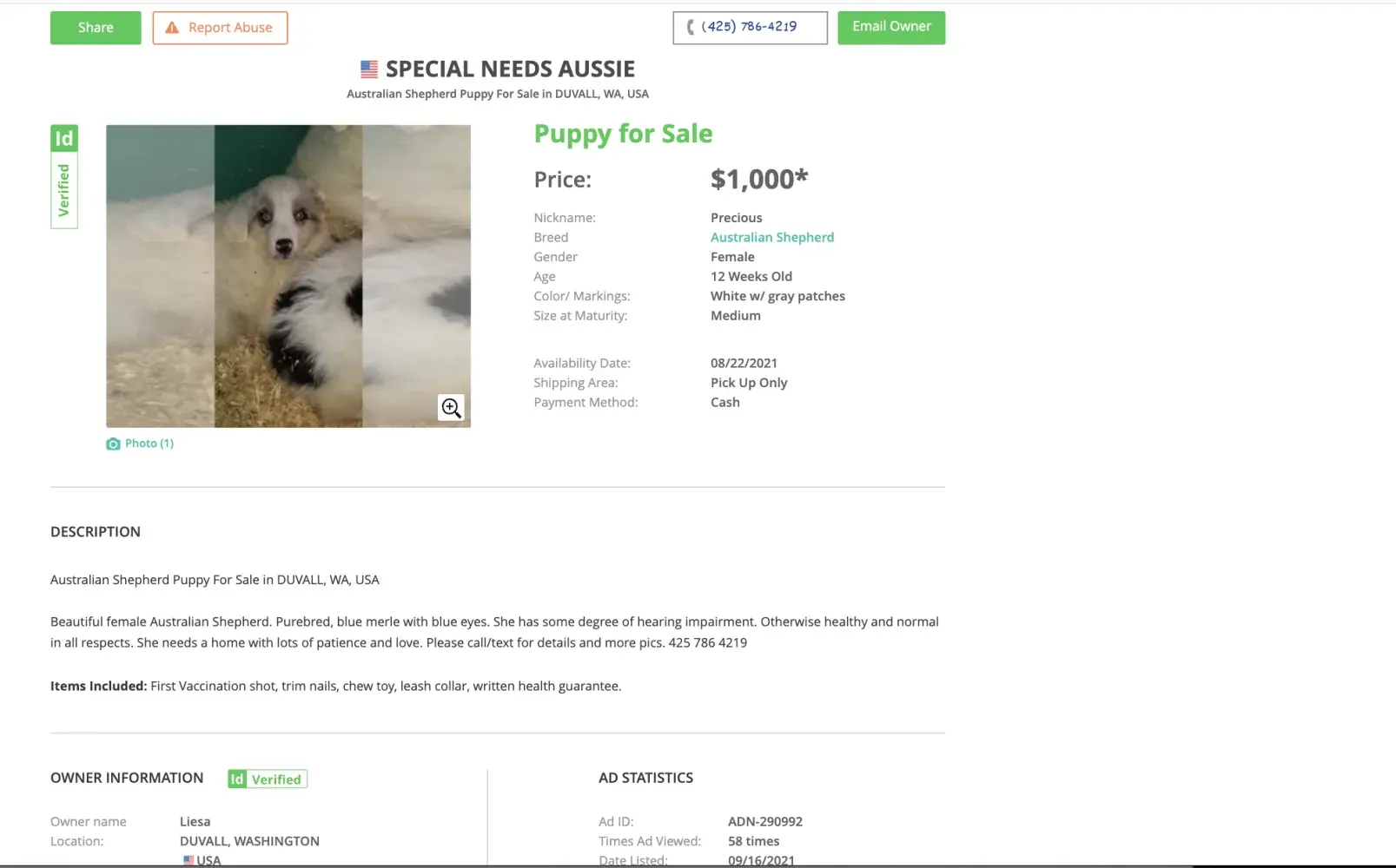 This woman has bad breeding practices and is not responsibly breeding australian shepherds. It's very clear when you visit her facility that she has too many dogs and animals. The biggest concern is her breeding of double merles, which results in deaf and blind puppies. She does this in order to get more merle puppies, which sell for more. This is extremely frowned upon and is very problematic. Attached is an example of one of her posts trying to sell a double merle puppy, which as she states suffers from hearing issues. The puppy is right next to another white aussie puppy (another sign of double merles).