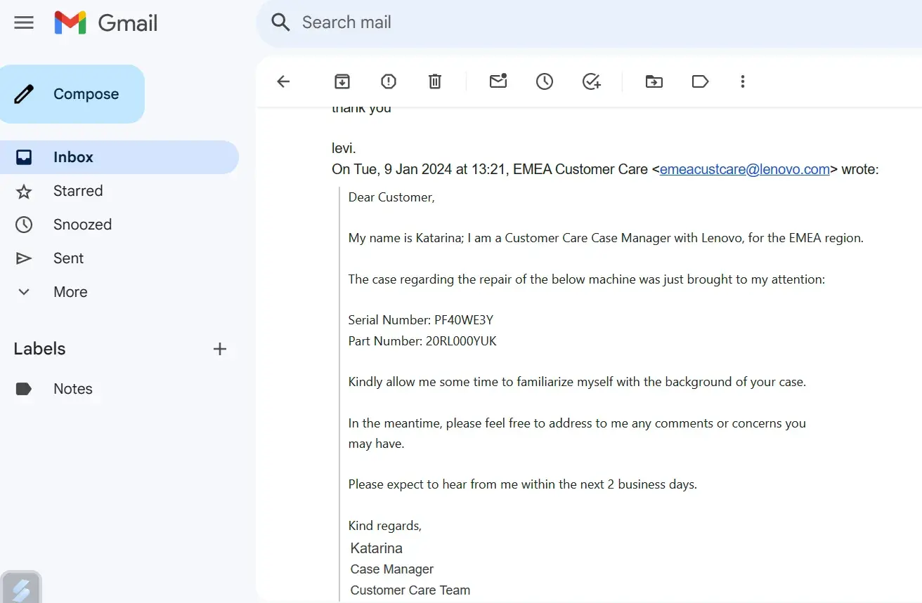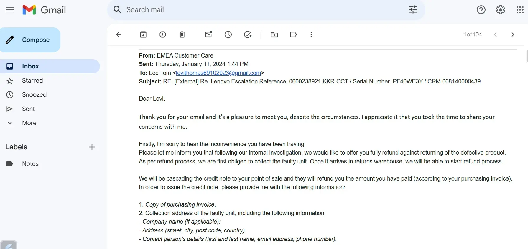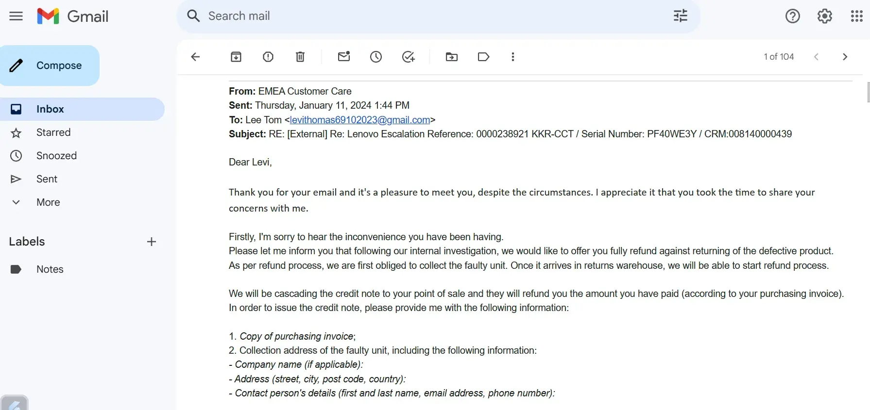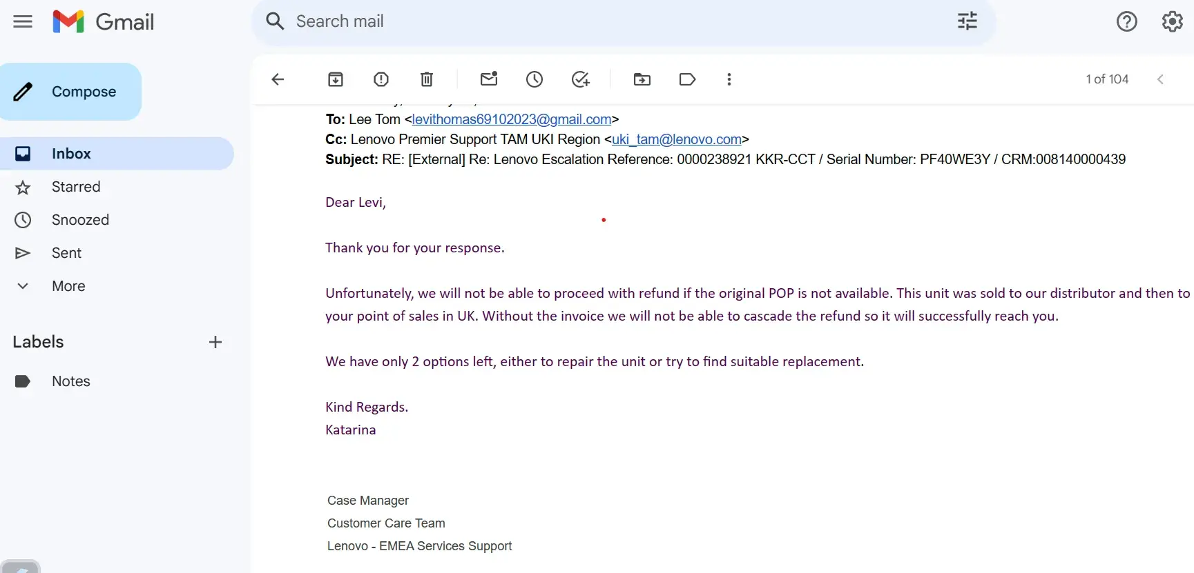 I complaint that Lenovo has failed to settle this case with the customer since I reported the broken hinge problem on 8 Oct 2023. This was the date long before the warranty expired. From 6 Jul 2024 to 12 May 2025, I had received 12 replies on Lenovo Case 2015683305 that were sent by Maggie Luk. She is the CX Case Manager, Customer Care Center, AP Service...