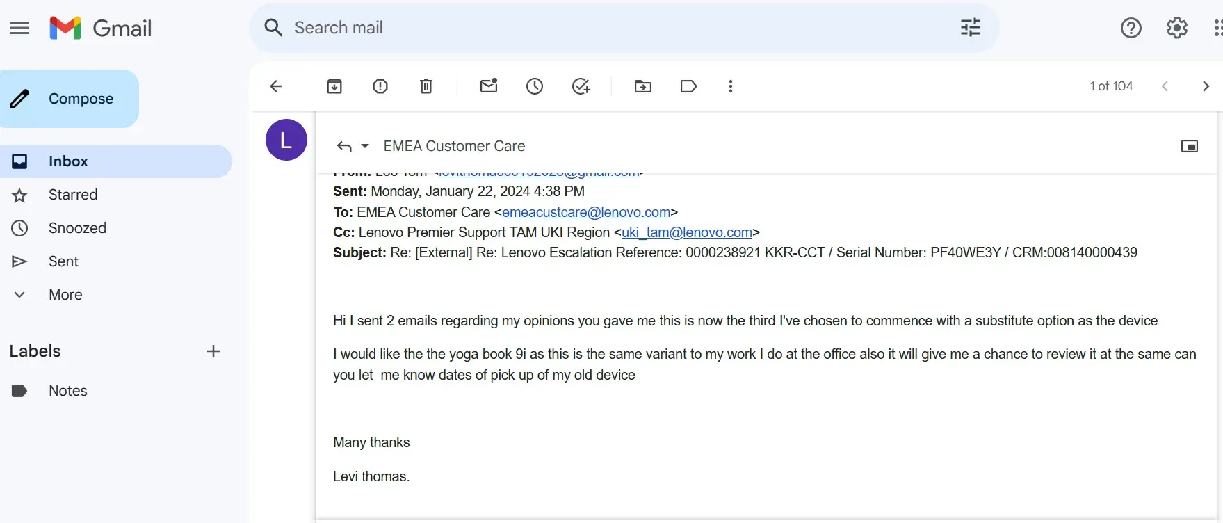 hi i want to put in a complaint regarding the lack of service/no service I've experienced in my case I've waited months for my item to be replaced /repaired I've kept all emails I was told that I have three options regrading my machine after months of waiting on item to be repaired ,. 1 refund 2 repair 3 suitable replacement as I not longer had the invoices I agreed to a suitable replacement after months of being told it would be picked up even missing work I work in a high power position at my firm and takin time off cost me money and I've waited months waiting I've called in and they have a agreed with me every person I spoke to but say they have to speak to management Lenovo are a huge company I didn't expect this kind of serve i have full warranty and I'm being treated unfairly now they have changed the ticket number basically disagreeing all the months I've waited and it says on the old ticked competed so basically lying now under this so called new ticket they haven't mentioned anything about my options and said i agreed to a fix unit at this point no i did not agree to that i have all the emails ticket numbers etc this is now unacceptable and I'm not happy and I want what i was told out of my options and a complaint to go forward even if I have to go to small courts I'm not a person that does not stand up for his rights .