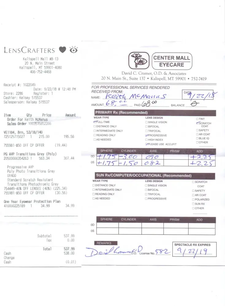 I recently went into Lens Crafters because I needed glasses right away. I broke mine and being a truck driver needed them asap. The employees at the Kalispell Location were not very helpful. This is not a busy location and the girl at the counter never walked out from behind the desk to show me glasses she pointed to where the frames were located. We spent some time picking out a frame. Neither employee was very interested in helping. I picked out a pair of frames, and found out this would be the frames used for my glasses. I know this is one hour however it does bother me that I am paying a large amount of money for frames that other people have tried on and stretched etc. When I went in to pick up the glasses. They handed them to me said how do they feel and sent me on my way. The right bow is too close to my head causing a pressure point on my head. The screw is loose on that bow also. I don't think the bifocal is located in the correct place either. I also feel that the price for what I received is very expensive. The cost before the discount was over 700.00 and when I was able to go to my eye doctor and get (2) pair of glasses the cost was only about the same price. I know it is difficult to get quality employees in this valley but for the price charged for my glasses I feel I should have gotten a better purchase experience and a better quality product. On a positive note I really like the doctor, he was gentle and professional.