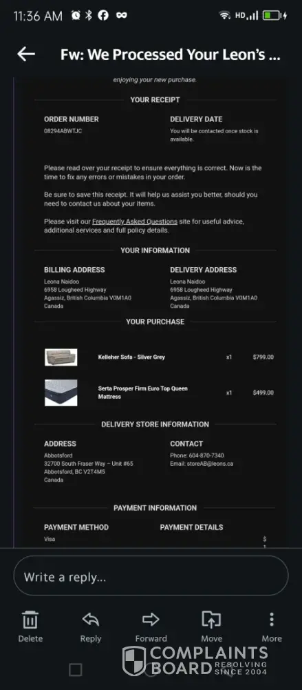 👉  Submit a complaint about Leon's Furniture