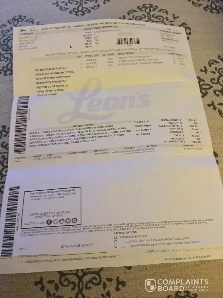 I didn't want to have to leave this review but my emails and calls have been ignored so I'm compelled to warn others of my experience at Leon's in Coquitlam BC. I was shopping for a dishwasher and received great service in store. Billy the sales rep and the manager (don't recall his name) were super helpful in explaining all our options and products. We...