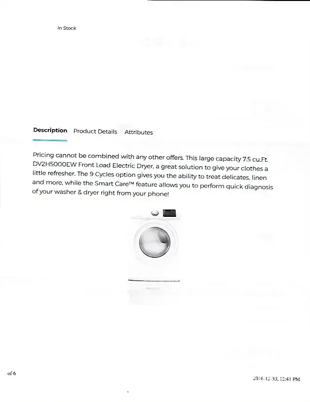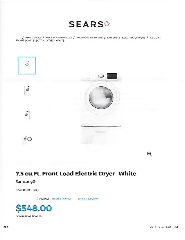 On Dec 17/16 I went to Leon's to look for a dryer. I told them that I was going to wait until after Christmas when all of the sales start to see if I found this dryer cheaper. I was told not to worry that if I found the dryer at a cheaper price within the next 60 days they would refund me the difference. I purchased the dryer for $629.99 + $81.90 HST total of $711.89. I found the exact same dryer for $548.00, I called the store on Dec. 30/16 about the price match and was told to bring in a printed copy showing the cheaper price. When I arrived at the store with the paper work they would not match the price. They also told me they do not accept returns on appliances.