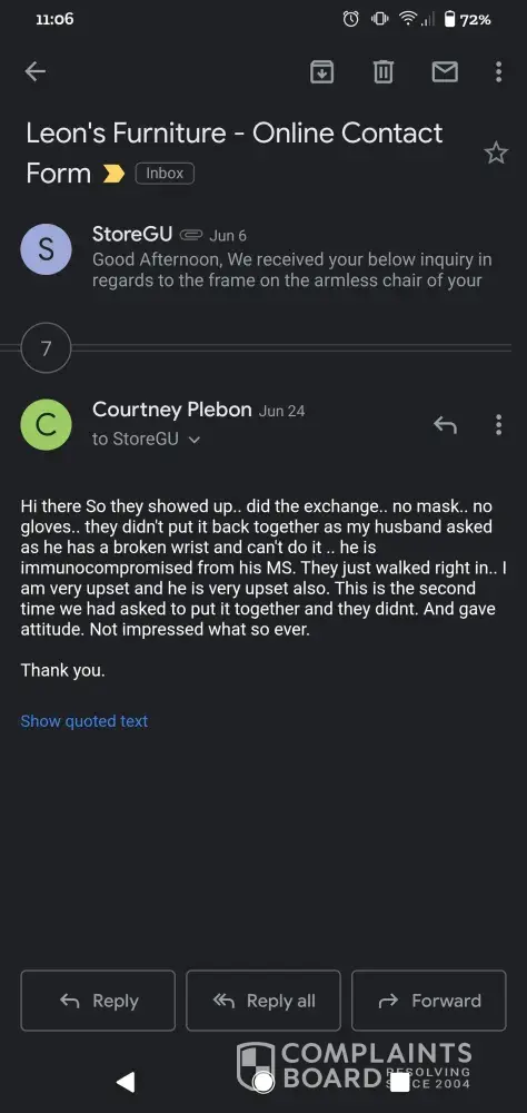 Hi there my name is Courtney and my husband David Tanti. We bought a sectional last year September. We have had nothing but issues with it. We got one piece replaced and now 3 more have gone to crap. We have emailed leons about back in June and we have not got an email back. When we got the first one replaced the delivery guy just walked into our place didnt knock or wear a mask. My husband also asked him to put it together as he had a Brocken wrist. The guy just left it there and didn't put it together. Now today we went back to leons to get a swap done. We had a credit of 1900 something. So we talked to a sales person we said to him we want to get another sectional at this cost tax in. Last year September we spend 11000 in this store. So we asked him the one couch we fell in love with was about a few hundred more but we said can u match the credit I have. He said let me go talk to a manager. He went away and didn't even go to the counter were she was. So he lied saying he will ask the manager. So the couch we were looking at was 2400 and we asked if you can match our credit and he kept saying no and young the price. We walked in and said we want a 6 price sectional for the same amount as our credit. But he kept using the price when we asked. Than he said I'm sorry I can't help you with anything. Attached is the email I sent to them and they ignored us. I want to stay going to leons but the attitude we have been getting and nothing but issues with the product I just want to go somewhere else. I would like to get this resolved and get a couch that doesn't break down everyday. We also had someone in to examine the product and leons said they will do a straight exchange we they havent please resolve this.