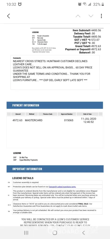 Ordered two couches for five thousand CAD on 11 Jul 2020 from Leon's Ottawa West through sales rep Brian V. Receipt clearly states delivery between early and late September (screen shot included).