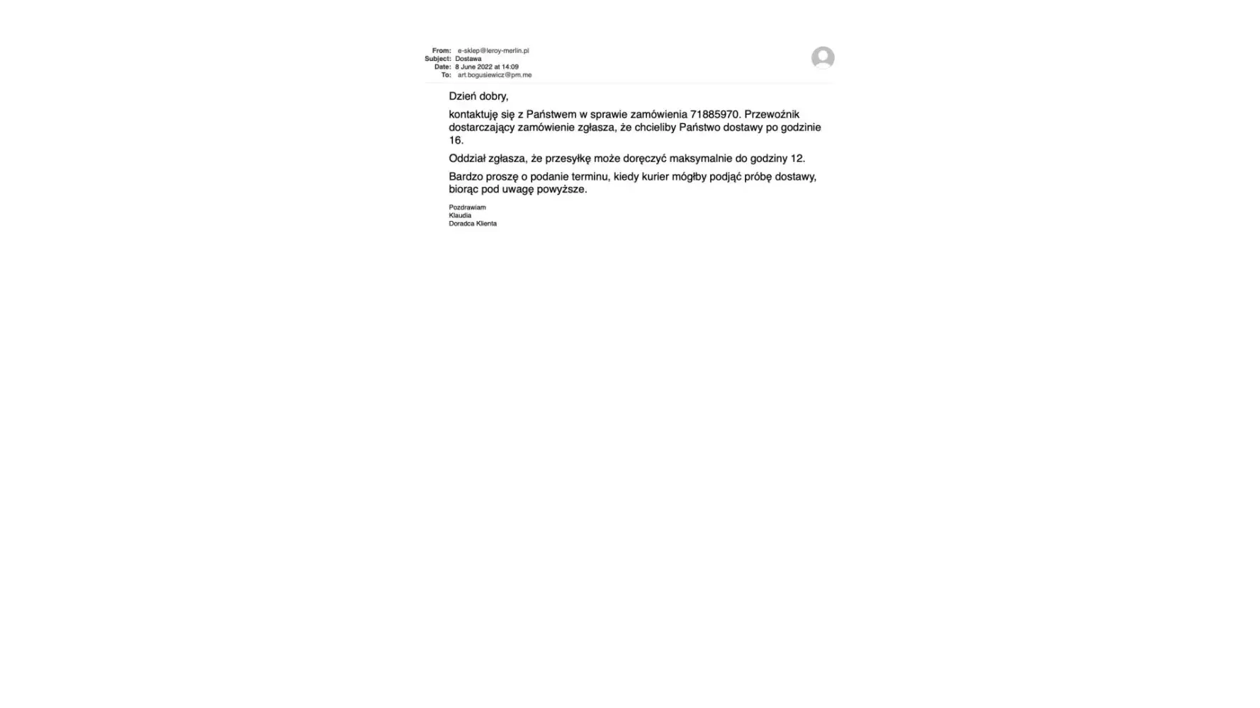 This merchandise was expected to be delivered within 48 hours, but to date, the shipment has not been delivered. The courier company did not notify me when it would be delivered. Yesterday they called at 6 am that he was around my place, but no one was at home, so I asked for it to be delivered on the same day, but after 12. The courier replied that he was working only until 12, refusing to deliver it on the same day. What is more, the shipment company Geis. pl registered this in its 'tracking the parcel system’ as '' pickup refused ' '- which is a lie. You mislead your customers by cheating about the terms of delivery. Geis only works Mon - Fri and only delivers until 12.00 - this information should be posted on the site. I will not buy anything from Leroy Merlin because there is no delivery option in the afternoon when we come back from work. I expect partial compensation for the purchase of goods.