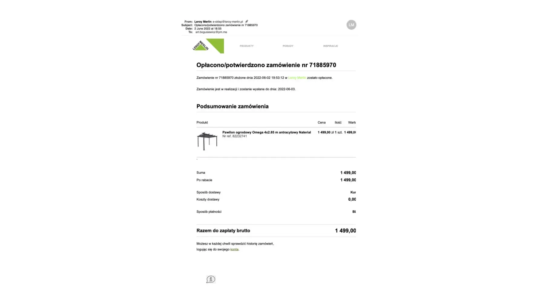 On 2 June 2022, I purchased this item: https://www.leroymerlin.pl/relaks-w-ogrodzie/parasole-pawilony-markizy/pawilony-i-namioty-ogrodowe/pawilon-ogrodowy-omega-4x2-85-m-antracytowy-naterial,p480728,l231.html.