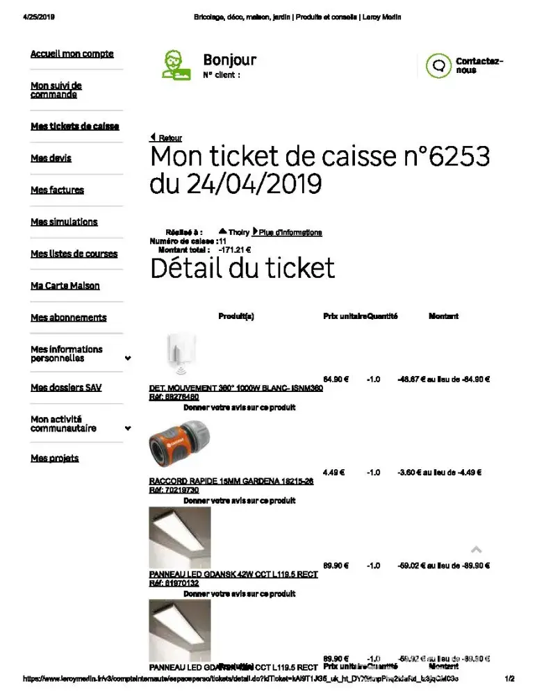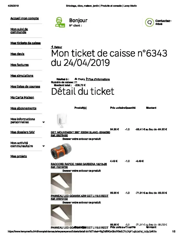 Receptionist Mme Sandrine took the products to return but silently without asking any question or telling me anything she returned my only 171.21 € instead of 206.72 €. As always until then I had strong confidence in Leroy Merlin which strongly got shattered when by chance I thought of checking with the bills of these products and discovered the fraud. After fidelity and all applicable deductions, it should have been 206.72 €.