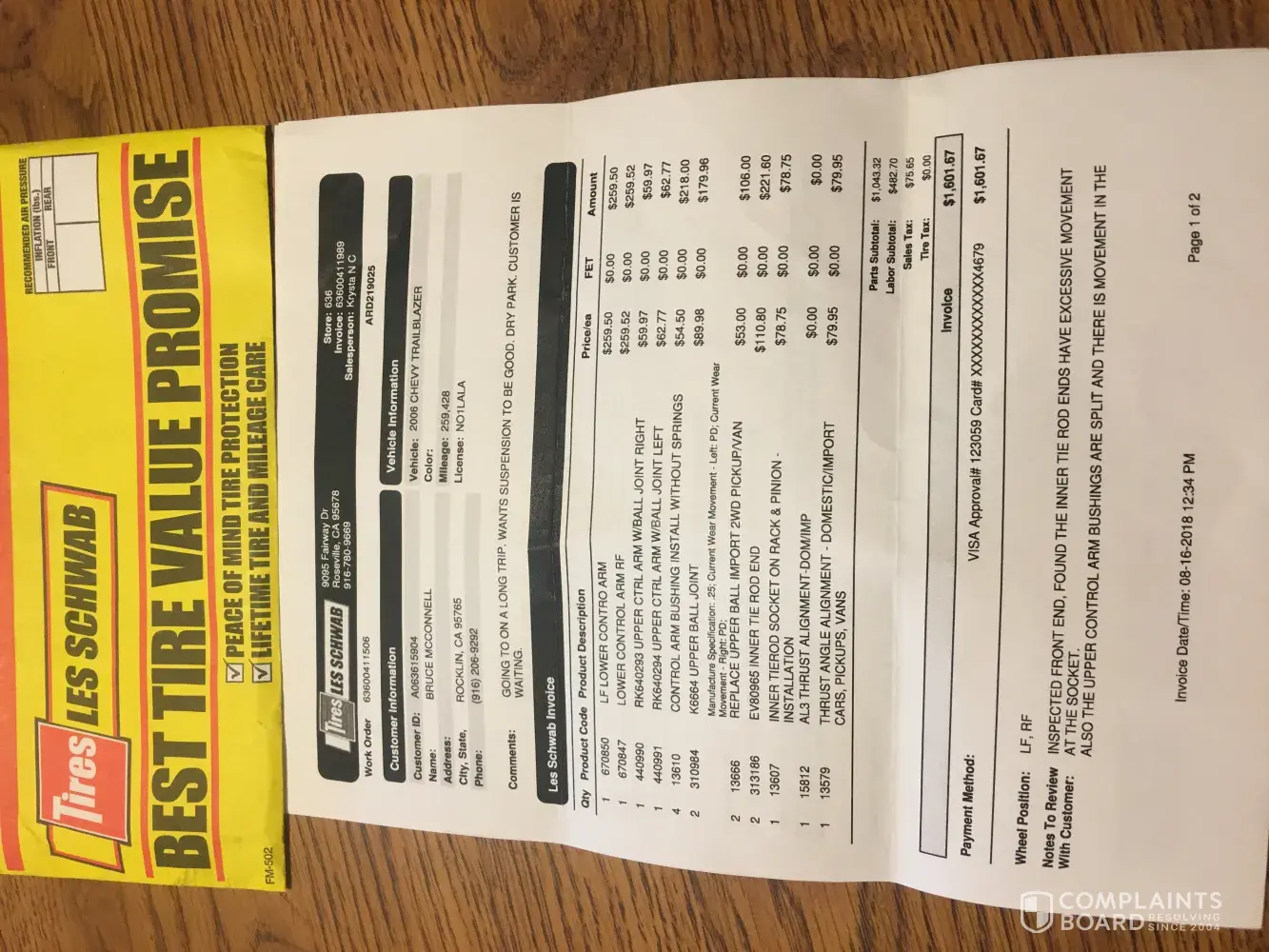 Les Schwab Tire Center second complaint/work #[protected]; customer id ao5586076