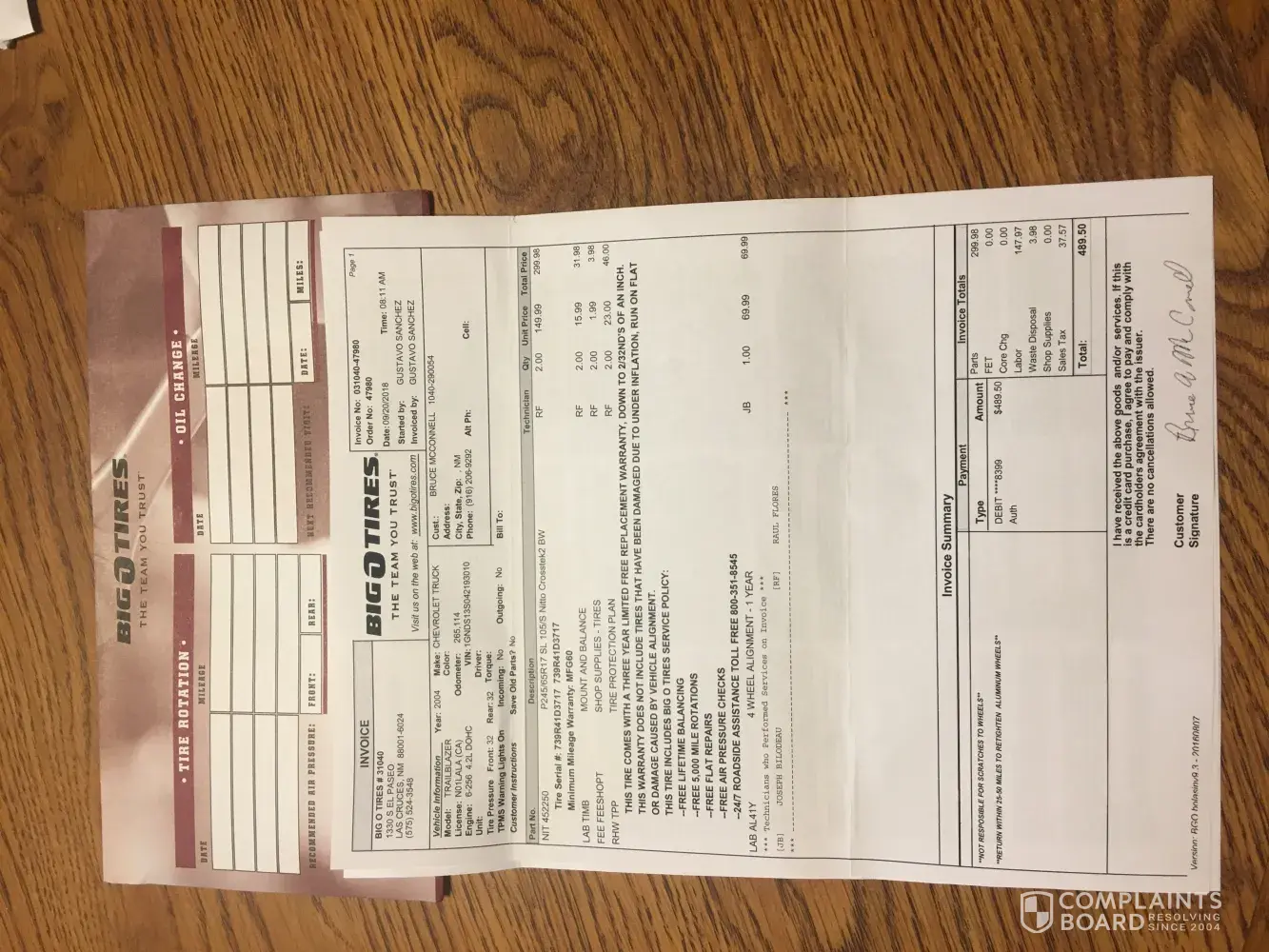 Because you do not have a shop in Las Cruces NM (I checked on the internet), I had to go to a Big "O" Tire store. I had to purchase 2 new tires. Tommy, the manager at Big O, came out and said that the pre-check that they do would show the initial and final measurements of the front end alignment. The pre-check showed that all initial measurements were out of specification (see attachments). I also had to have a front end alignment to make the necessary corrections.