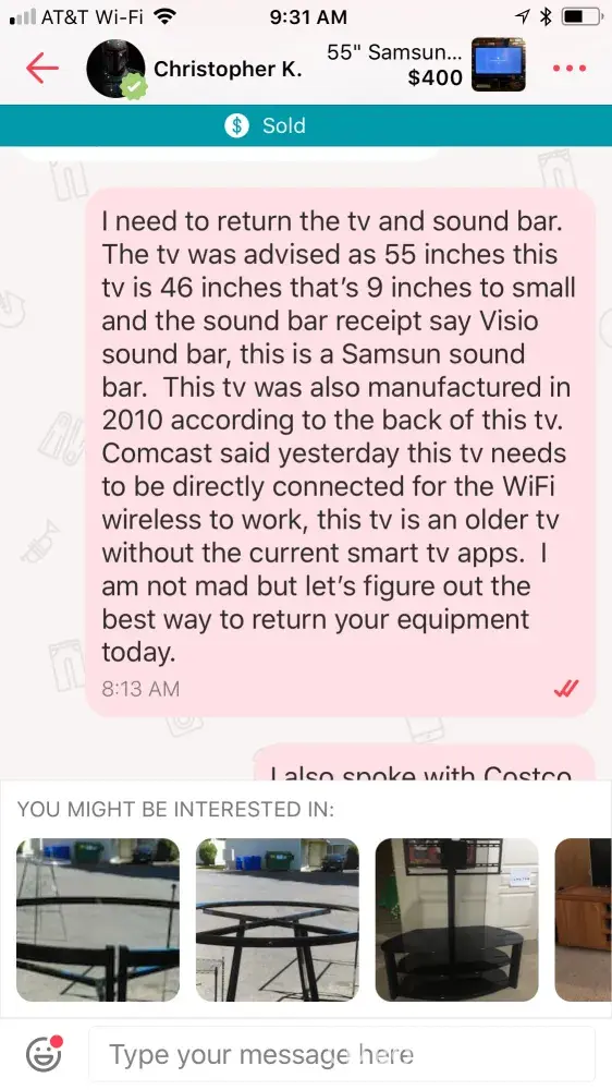 On Sept 8th, 2018 Christopher K. sold me a 2015 (55 inche) smart TV and sound bar for $340 in cash. His real name is Alex not Chris. His phone number is [protected].