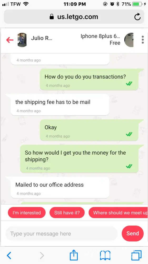 Please do something about all the scammers on your site! I've reported so many iPhone scammers using the app reporting system, but Letgo does nothing about it. No one sells a new iPhone XS MAX 256gb for $500 or $700. Letgo needs to protect the legitimate buyers and sellers on their site from these POS crooks! Just google home many people have been screwed out of the money and items ... sad!
