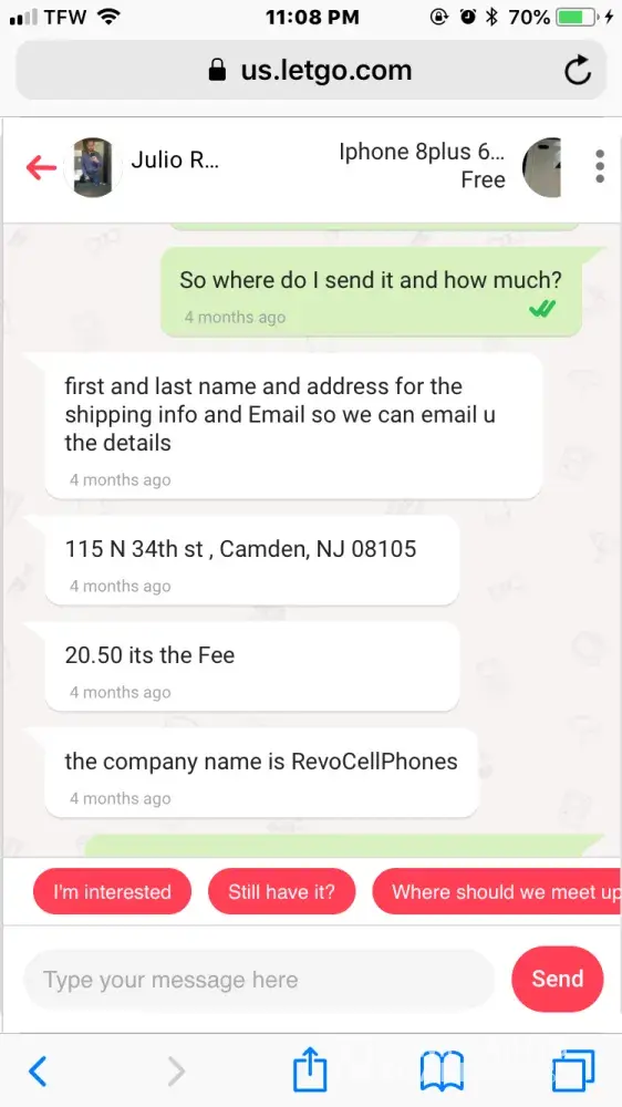 I messaged The seller, Julio Ramirez, about an iphone8 plus and shortly after he messaged me back and so I chatted a few days trying to figure out if it was really a scam or if it was legit but he had a website and everything you could go to. So eventually said you just had to pay shipping so I sent it to the address he provided but he ended up never completing his part of the exchange.
