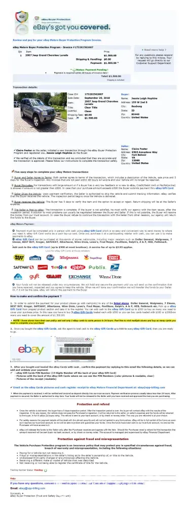 Requested more information on a jeep that a "Emily Porter " was selling and said her husband passed away and wanted the car gone. As a guy who lost him mom understood . So she sent me an email sending her the money through ebay and responded back normal and seemed legit. But as the arrival date came no keep no response or anything . So there went 2000k down drain for my girlfriend that I saved up for .