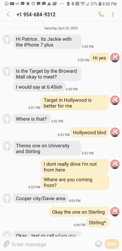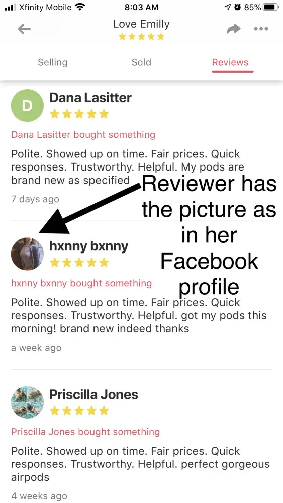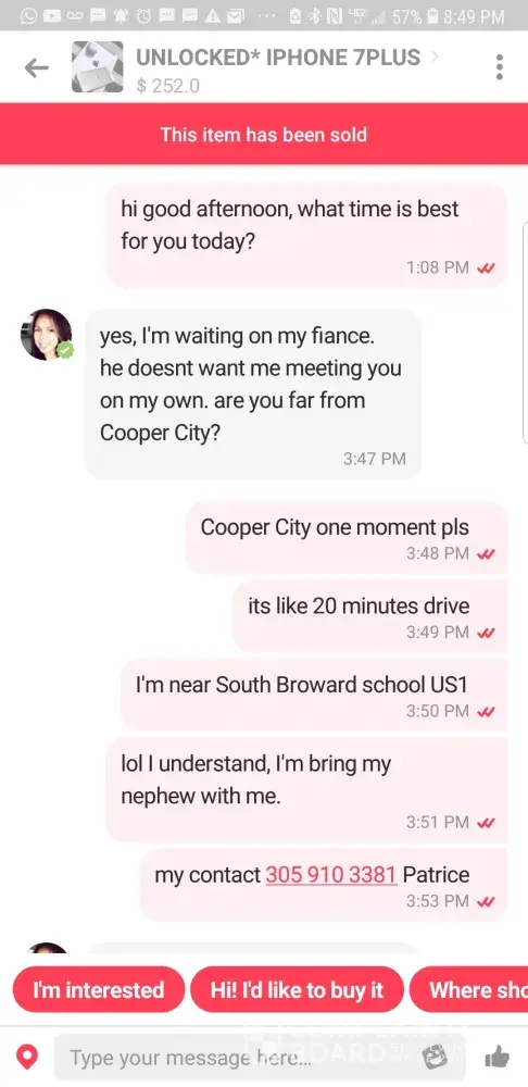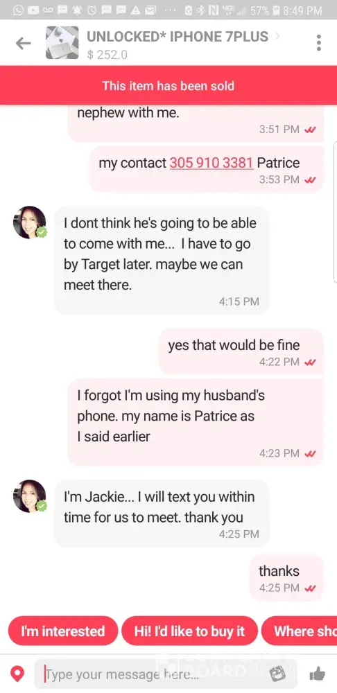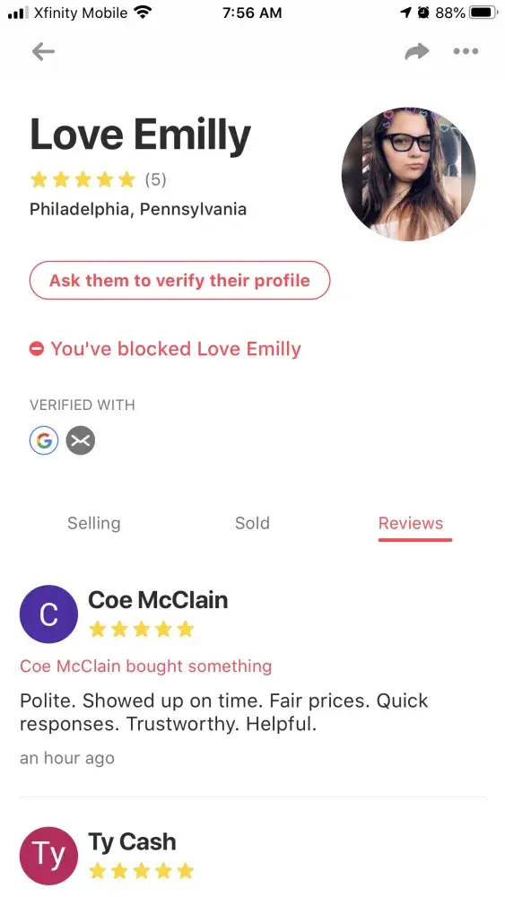 Two days ago I found an iPhone 8 Plus and contacted her/him through the app. After so much talking she convinced me to send her half the money of the purchase $90 through Facebook, - https://m.facebook.com/profile.php?id=100045745620358&_rdr - and I did, trusted her after reading 5 reviews giving her 5 stars and saying she was trustworthy. The worst of all is that even though I reported her to letgo, she is still scamming people today and has an active account.
