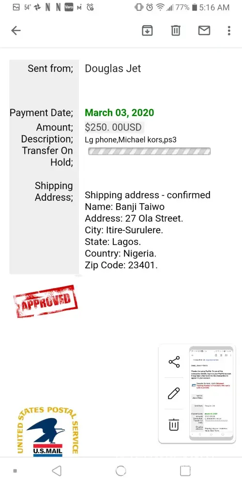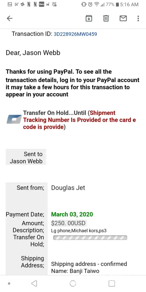Im not sure what information you need from me. Ill start with this. I have a scammer on letgo trying to get me to send him items that i have for sale and he wants to pay me through PayPal. He sent me the PayPal and i crossed referenced the transaction ID number and it came back as a scammer. Someone had already been scammed with the same PayPal transaction in 2018 on letgo almost word for word. So i thought I'd report him before he gets to someone else who isn't as wise as i am. If you need more info message me back. Thanks and have a blessed day. The picture of the man is what i came up with from the name he provided me with on his return address