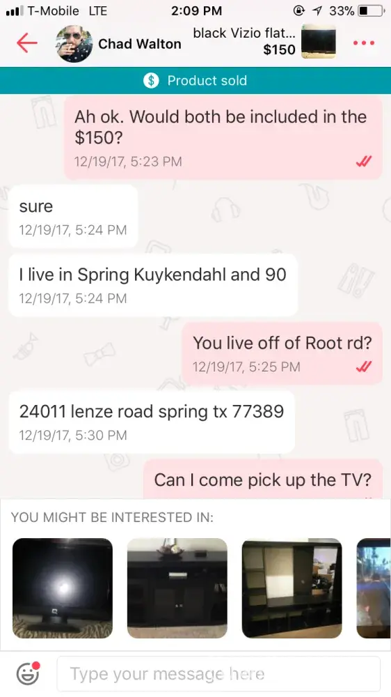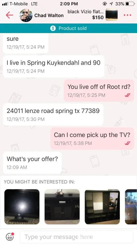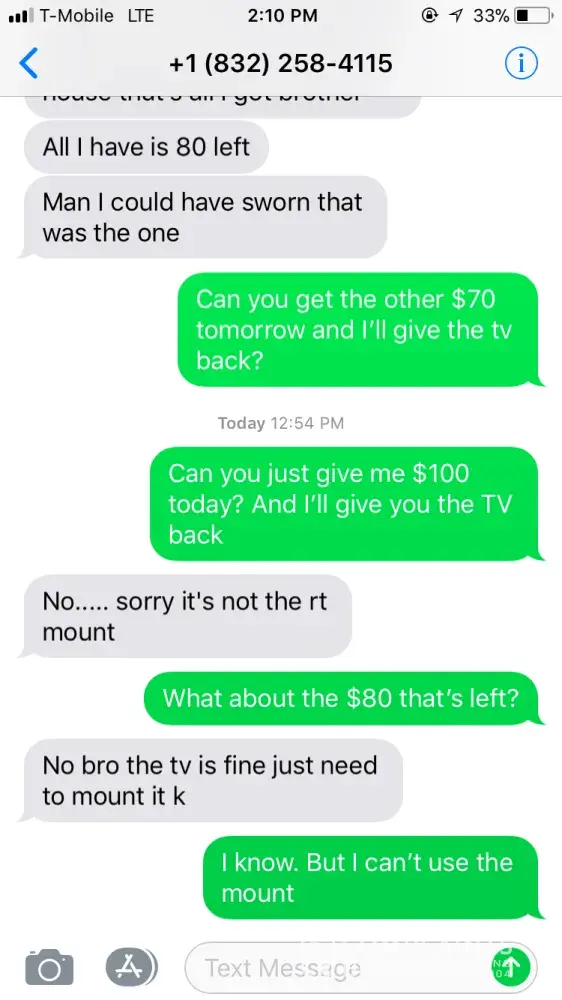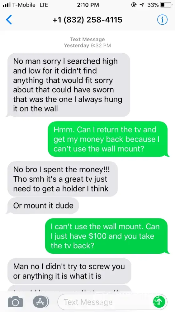 Chad sold me a TV with a wall mount and a stand that go with the TV but the stand doesn't fit the TV, I just want my $150 back. I've even offered to take $100, if he would just take the TV back. After I messaged him about the stand not fitting, he claims that he didn't try to screw me and that "it is what it is" I also can't use the wall mount. I'm sure the TV works fine.