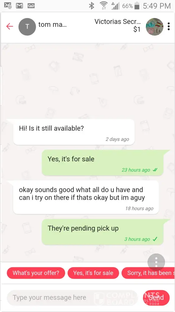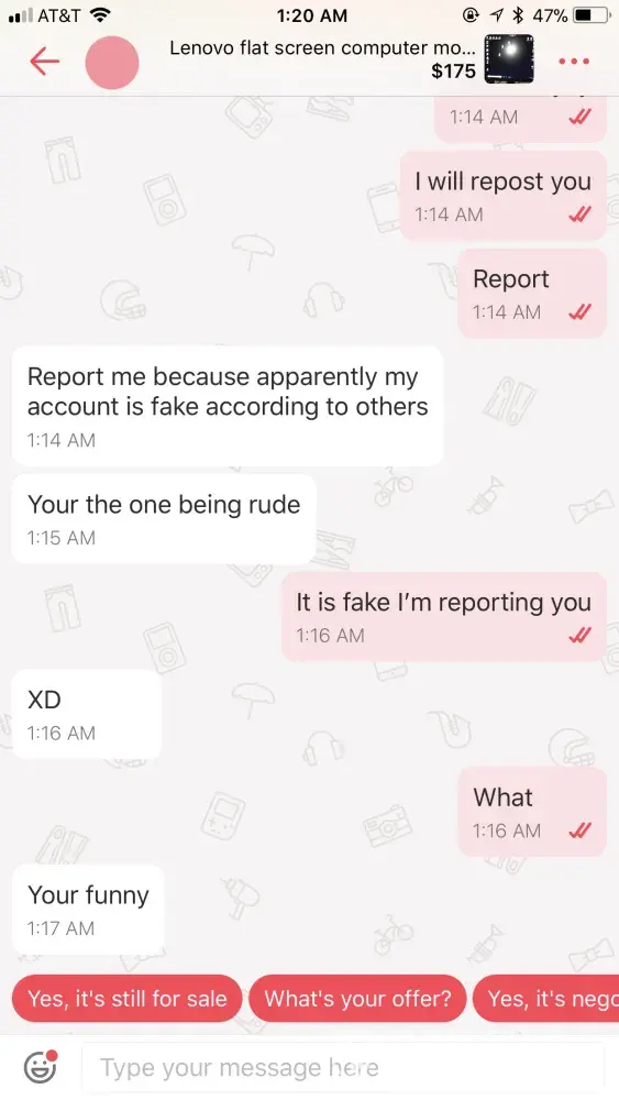 I am selling bras and a male user asked if he may try one on in my home. I'm reportin due to harrassment. Please see photos for fuether description of this incident. I'm unable to find another way to report this, so I do hope I am contacting the correct entity. I would hate for this to happen to a vulnerable person and that person be in potenting danger. I've blocked the user as of now.