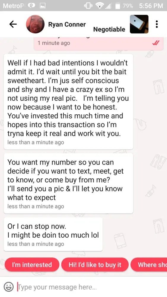 I saw a post from Ryan Conner for an iPhone 6 plus. He is catfishing, I don't know how many other people, but I'm afraid for them and myself. So I didn't go, he admit he is a catfish with fake profile picture. He kept saying I look like a crazy person. So you guys need to watch out for these people. He wasted my time and effort. And it is not acceptable.