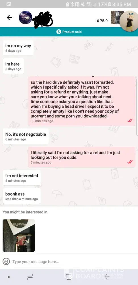 So I bought an ssd that the seller assured me was formatted. I went to do a clean Windows install only yo have it boot directly into Windows. It opens up to this kids desktop. Which has the usuals you'd expect Minecraft, steam, utorrent, and a PORN folder. And a not well hidden one at that. So I formatted it and went on with my day. I figured I should tell the kid so he knows for next time so he's not selling hardware with personal data on it. So I sent him a message which may have been a little rude. But least asking for a refund or anything I just figured he should know. He then changes his review of me that was 5 stars to 1 star. Saying I was rude and saying I was lying. He then proceeded to call me a "boonk [censored]" so I blocked him and now I can't review him. So all people see is his side of the story even though I was looking out for him. There was probably no sensitive information on there and I didn't go looking. I literally saw the desktop and Windows pop up when no went to restart so I could format it. I know it was his because there were like thumbnails from selfies he saved to his desktop.