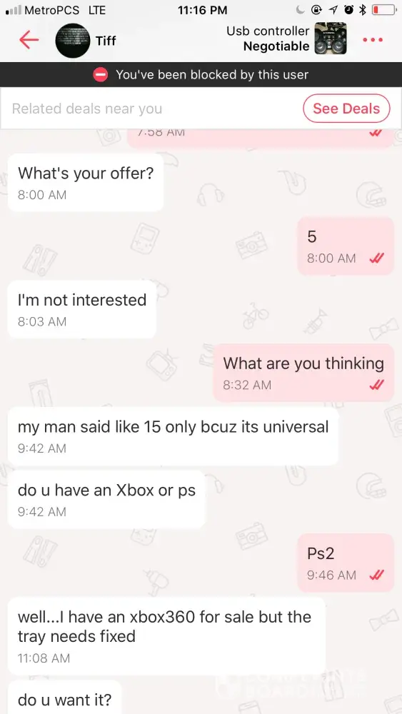 There was this user named CrowTech who sells iphones. We later exchanged numbers to send more pictures of the phone. He said he mailed it but it has not yet arrived and he is not answering his cell. I believe he's a scammer. I just realized his number is fake and I gave him $200. I witheld the rest of the money until my packaged arrrived and he stopped responding and blocked me from his number and on the app.