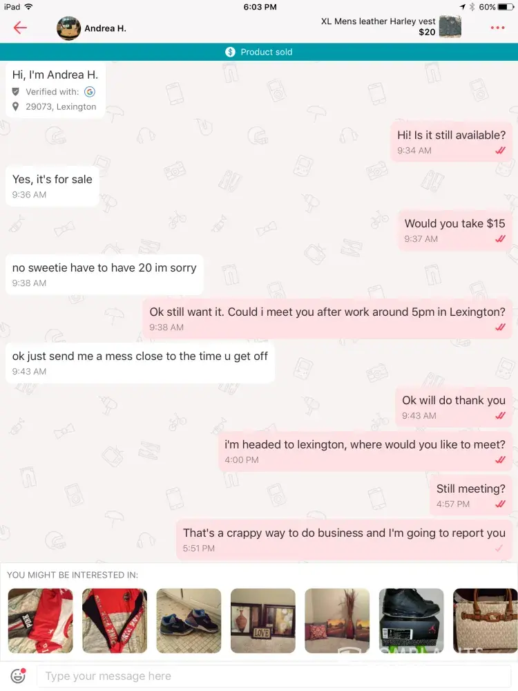 Hello my name is Wes Murray. I recently joined Letgo and like your site. I found an item I liked and contacted the poster. Her User name is Andrea H. agreed to my price for this item of $20. I told her I would meet her after work. She told me to call her when I was on my way. I did this a couple of times but she never responded. Now I see the item was sold.