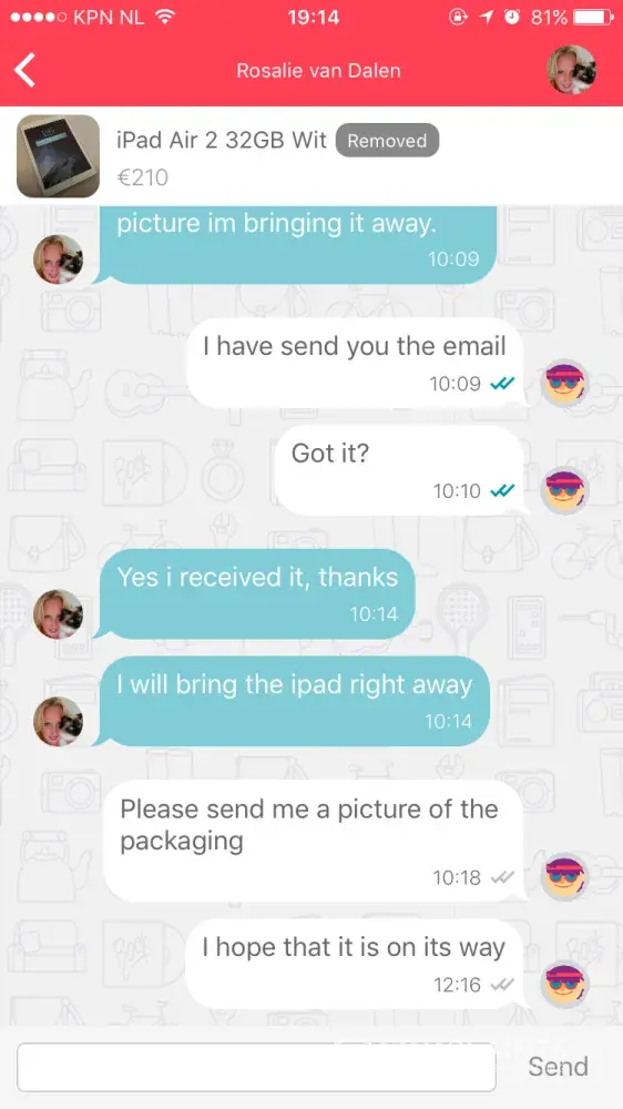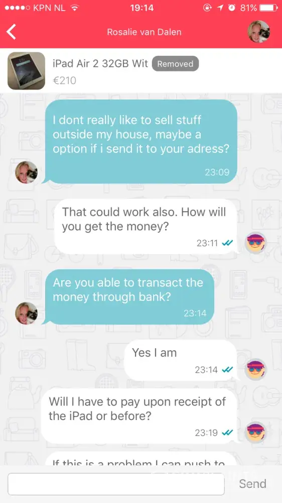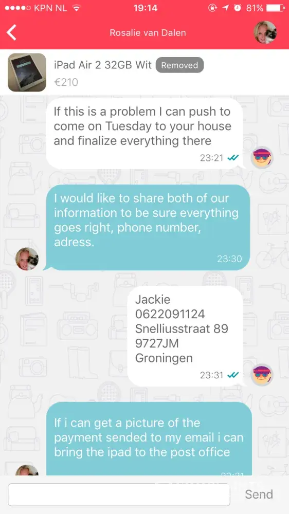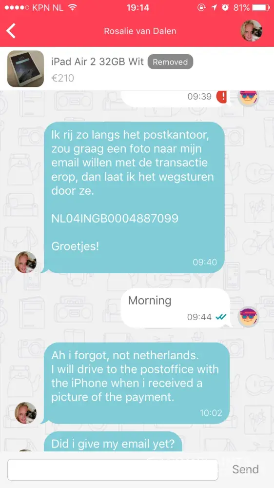 I was scammed by a ms Rosalie van Dalen. She was selling an iPad Air 2 and an iPhone I put in an offer. Emese both agreed to it and she asked me to transfer the money into her account which I did and the last I heard from her she was on her way to send the iPad my way. Ever since she removed the add, her phone is on voicemail and never responds to emails or request for payment. This was on the 18th of September 2017. I went to the police station to file a complaint and was advised to send this complaint.