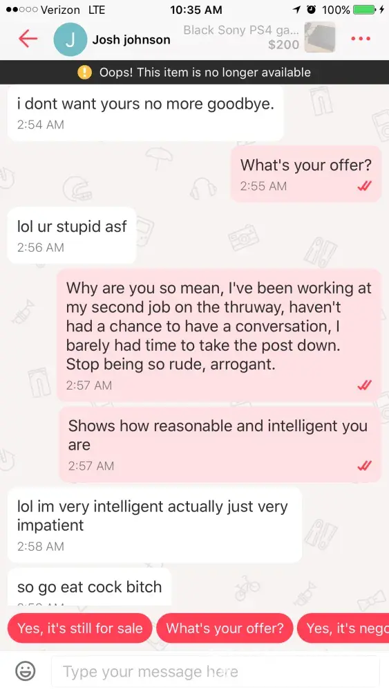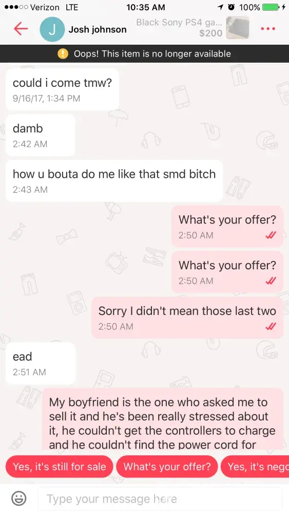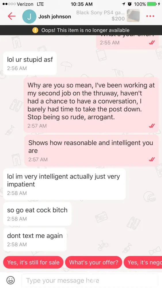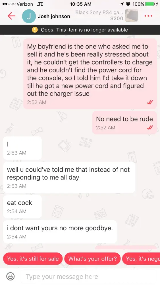 So I have been trying to see my boyfriends PS4 for him but he's been having a lot of issues with the console, he couldn't find a cord to it and the controllers weren't charging, so I decided to take the product down until we could figure out the issues. I was the verbally abused by a buyer who was mad that I took the listing down, I did try reporting him last night but he since continued the aggressively rude abuse. I've included pictures of the things he said to me.