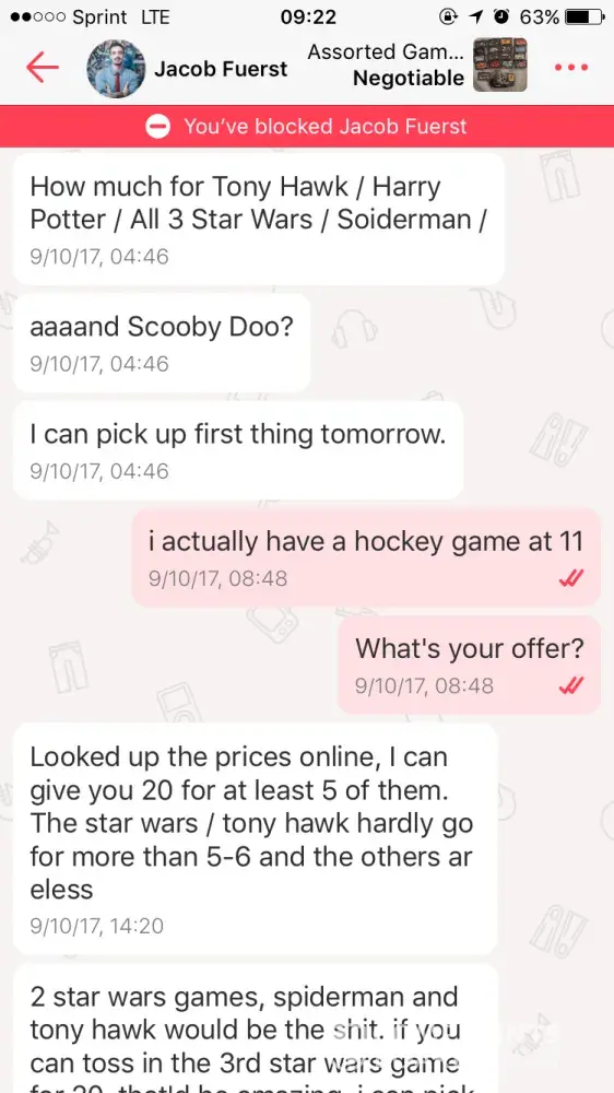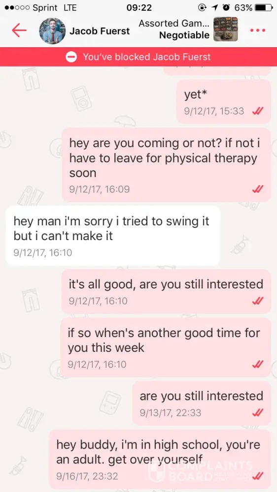 I was left a bad review after the man, Jacob Fuerst, did not show up to meet after saying he would. We had talked about a meet up for me to sell some Gameboy Advanced games for $20. I am in high school, and this man is a [censor]. I have another seller, so the issue isn't the money itself, it's the rating my account will receive. I'd like to continue selling, therefore the bad rating just does not look good for my account. Very odd man child, please resolve.
