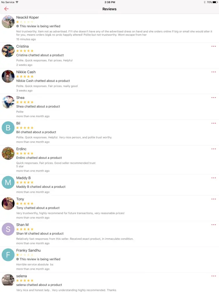 This woman name Neacil koper told me she wanted to buy this certain dress from me. And she came to my home and in stead of buy the dress she had this old wedding dress she wanted me to buy off her. I told her I don't do that my company starlite bridal doesn't deal with old clothes like that. She got very upset and she said some very bad reviews about me. Which is very bad for my business please look at her reviews and I want her never to come on my Ada and harass me no more