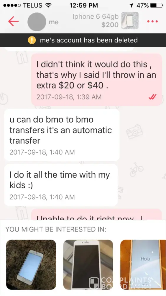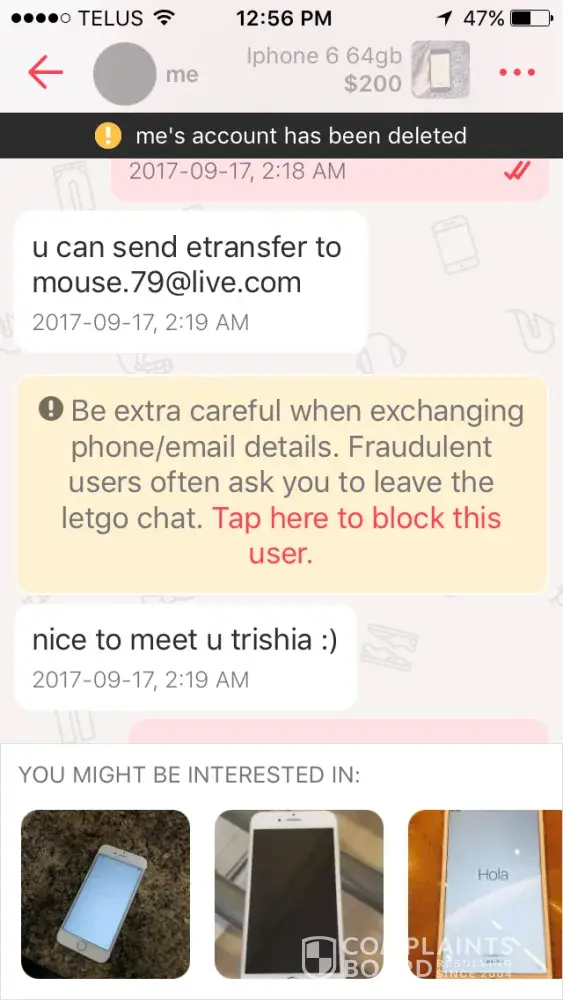 I was scammed / fraud from another let go customer as I contacted the bank since it was done through email transfer . Person has not got back to me on my parcel that was suppose to be shipped and nothing was in my mail like he said it would be sent or has been sent so he says . The tracking number he gave me ain't in Canada post tracking system . His let go account is now deleted and he has collected my money already . I have an ongoing investigation with my bank who will find out more about