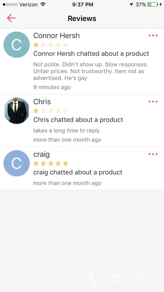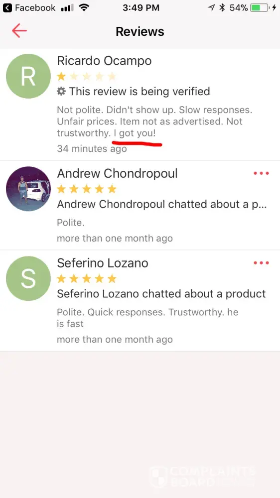 A user calld fish left a message saying to check out his page, which is advertising without paying and wasting my time. i said are you interested and got no reply so i left a review saying he was advertising and wastunv my time and then i blocked him. then he made a fake account under the name ricardo and said he was interested and tried to get my adress. We made plans and he lefy a phony review saying “got you†i really appreciate any efforts to make sure the review is taken down. thanks -Noah Armstrong