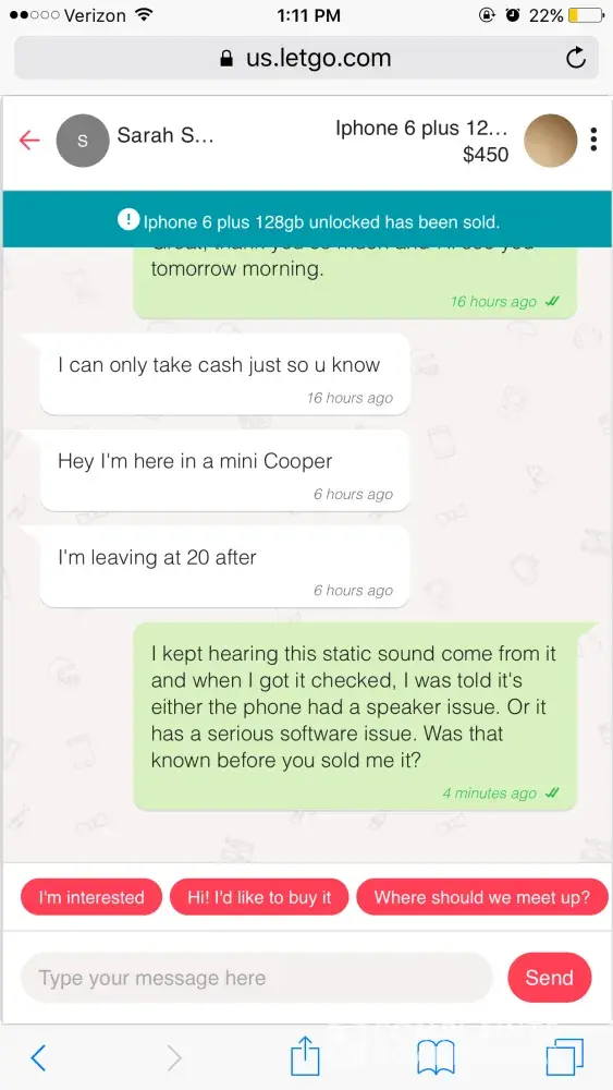 Hi my name is jordan, I have been usin the app letgo for quit some time. It came a time when I wanted to upgrade my ophone 6 to a 7... Long story short I found this good deal by someone selling one close to where I live everything in the post was legit clean iphone emei and all long story short when I bought the phone he had claimed it lost or stolen already so when I went to activate it they had told me its stolen... Its not stolen when I payed $380.00 for it... Money doesnt grow on trees... So I had contacted the seller and he had blocked me so im [censor] out of 380.00 because their are scamers on here! Very disappointed