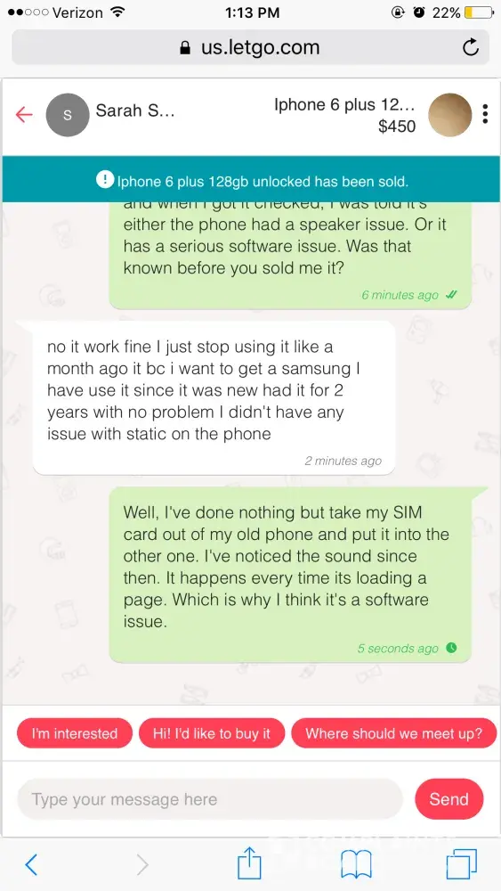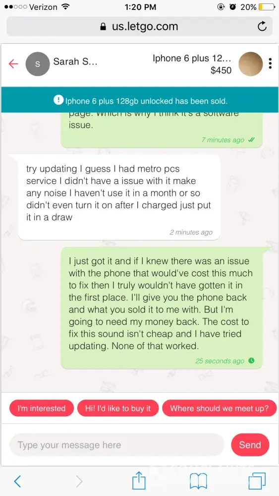 I made a purchase this morning for an iPhone 6 Plus and when I got home, I noticed that my newly purchased phone was making static sounds. I get it check to find out that's it's a software issue. I asked to meet her again to get my money back and I got no response. I went back on the site and saw it was under inspection. Can I have my money back?!