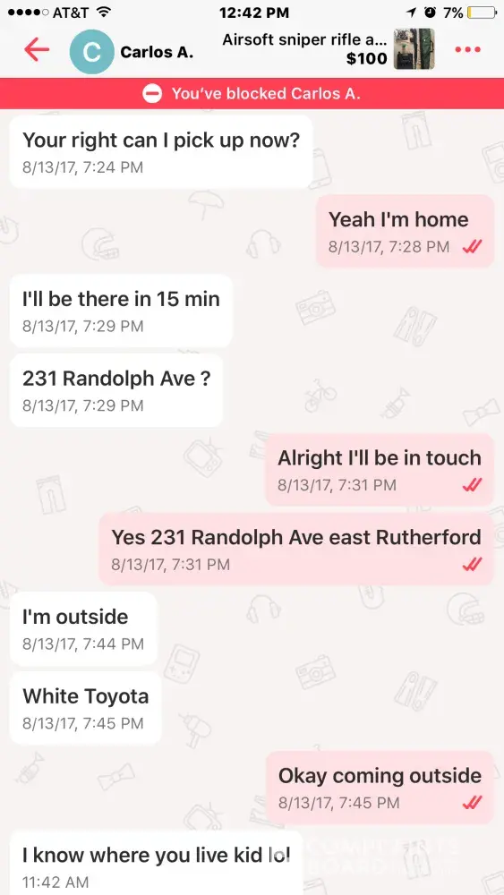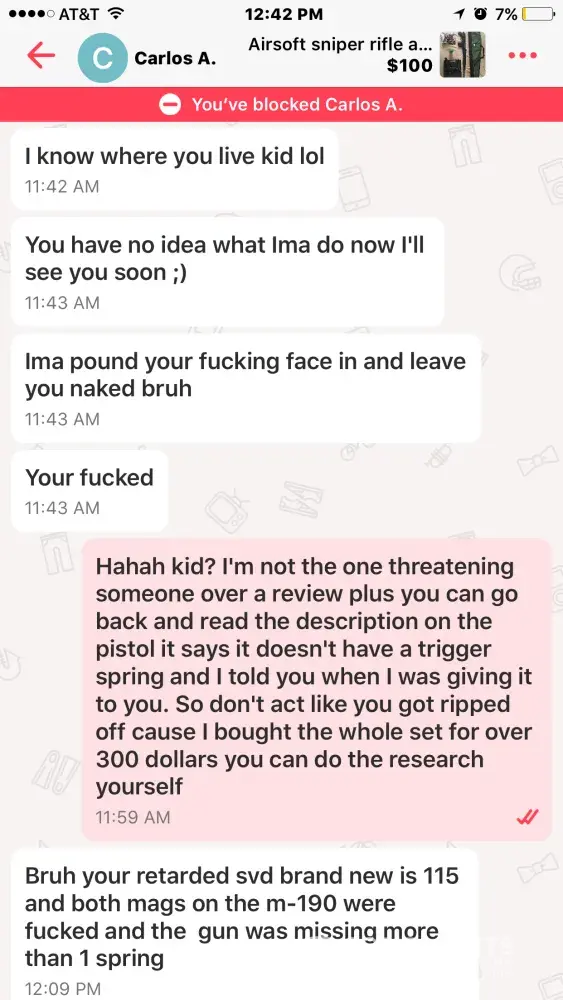 I sold someone something on letgo it looks like he didn't read the description that one of the items doesn't work and requires a spring in order to work.. he gave me a bad review saying I ripped him off so I wrote a review back defending myself.. now he has been messaging me threatening me that he knows where I live and he does know where I live because I gave him my address to pick up the item which was a bad idea not knowing that he was a crazy person. Now he is threatening me and the people in my household. I need to help to get the persons information to report him to the police.. please email me back as soon as possible amir.[protected]@gmail.com