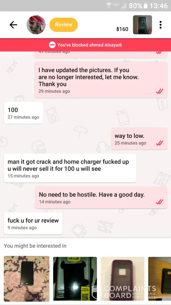 Ahmed Alsayadi contacted me about a product and I did my best to meet his needs for requests of new pictures, which I updated, and questions, which I answered honestly. When it came to a price I felt it was too low and he became ugly. I ended the conversation then immediatly left a review. He propmtly repsonded with more cussing. This is not the first time he was ugly with someone on here according to his review. Please do something about users like this. It makes me not want to use this app and makes me feel uncomfortable about using this app to meet furture people for buying or selling a product. Thank you