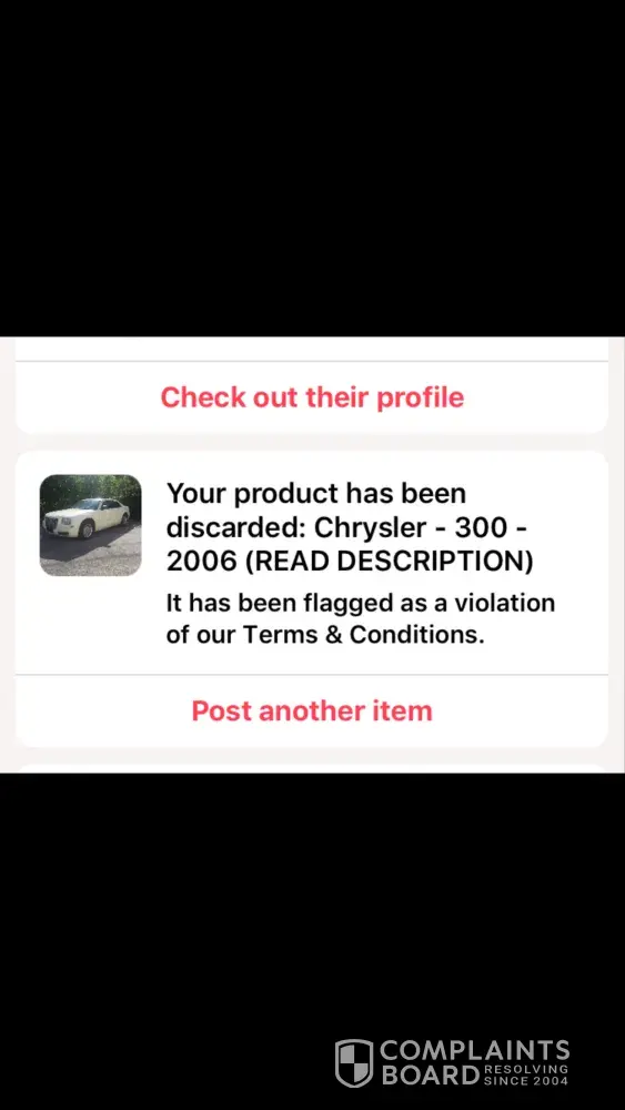 "Your product has been discarded: Chrysler 300, 2006" "Your item has been flagged as a violation of our Terms & Conditions." I just didn't understand why, it was removed. I tried to Google an explanation as to why it was, I found nothing. I even went through Letgo's "Terms & Conditions", I could NOT find anything about Vehicular Terms or anything like that.. I did happen to find, in all of the other bad reviews, another user had the same problem... His vehicle was removed for the same reason, I click on the link, it just takes me to all reviews ever listed. I went through quite a few pages, and still could NOT find his review to find an explanation, and maybe even a solution.. Please help me, and figure out why this happened. What do I do!?! Very Frustraited with this app.