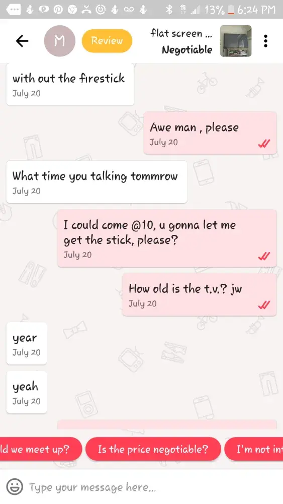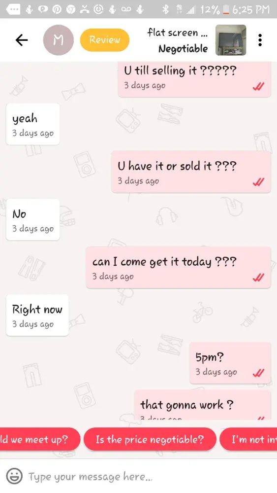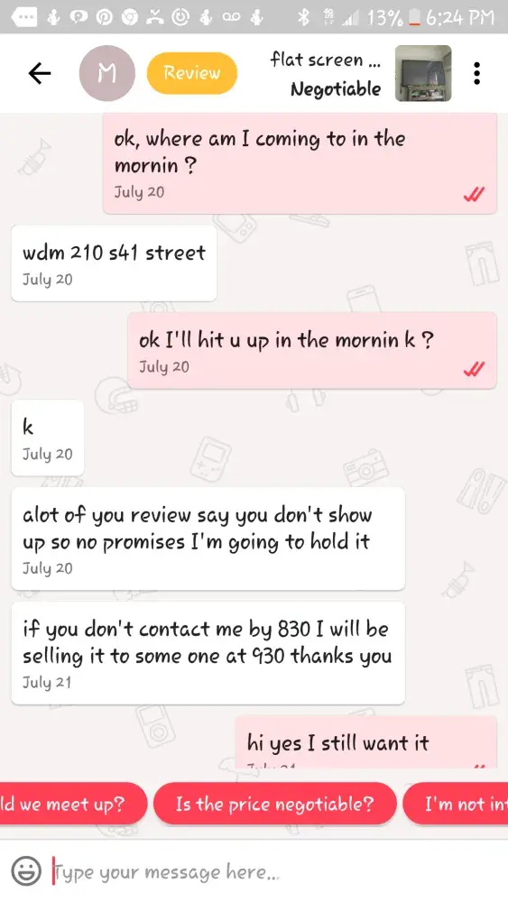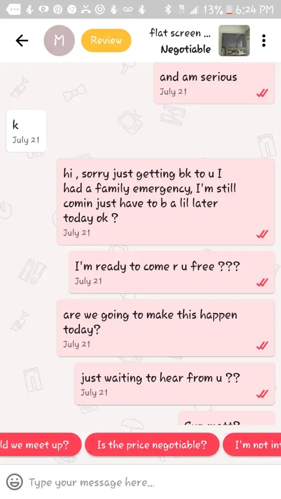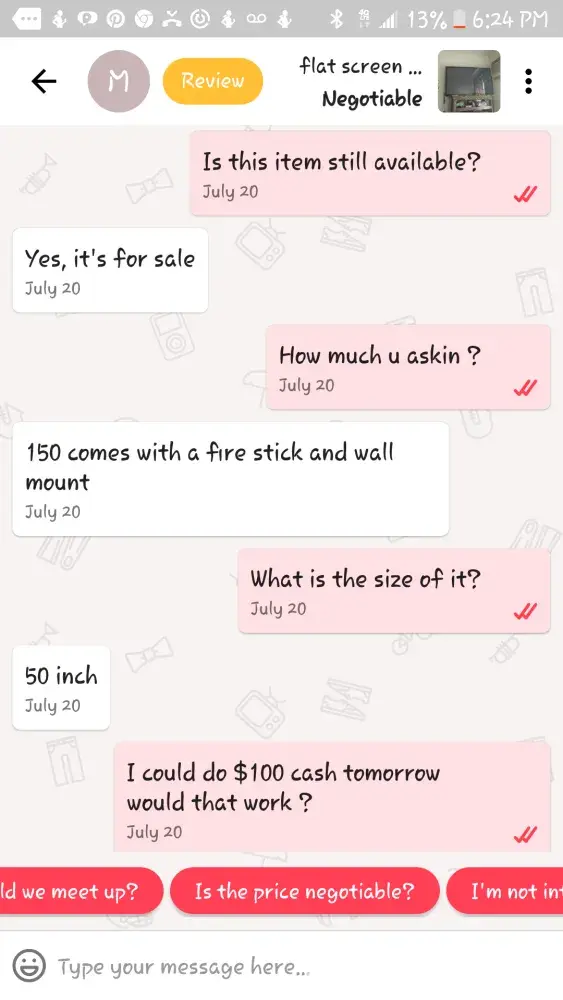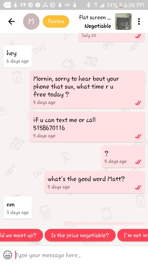 Every (I thought) that contact me don't buy anything, so are looking for advice for their products other's want your items for nothing and all, get this, has money and want to sale us items? After making these fake offers for you products, day and time of their arrival I get, it's raining, I have to talk to my husband or wife, i'm now at my grandsons soccer game (She had texted me as she was on her way, my time doesn't matter), my dog can't find my medication, i've changed my mind, the service man can't find my firestick (I beat she can find it) this is a site for those that already have and saleing their stuff to the less fortunate. Spending money they don't have. I think everyone of these companies are an inside scam