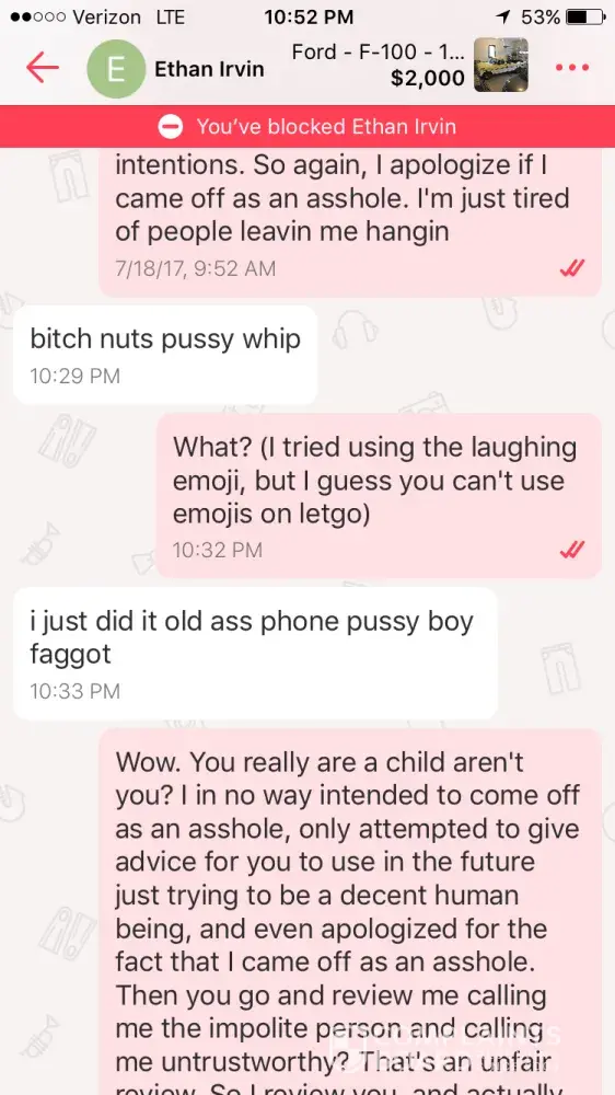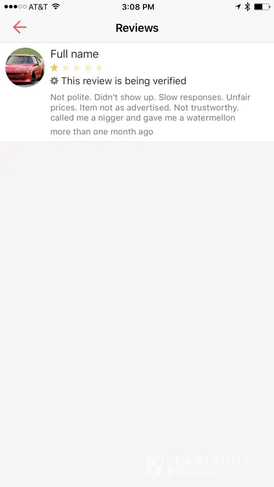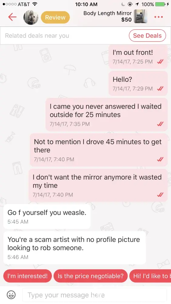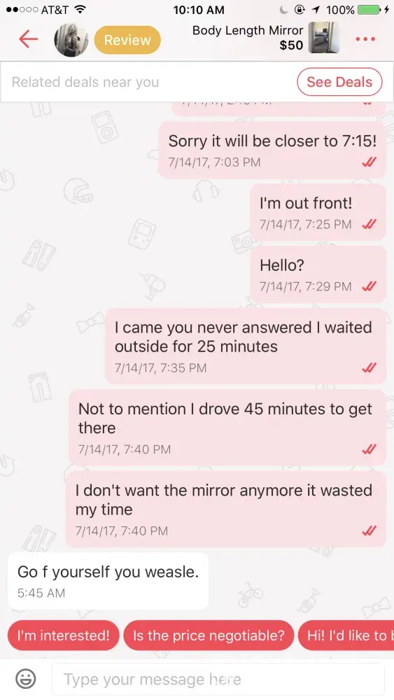 Hello! Yesterday I went to pick up an item from a seller, she had previously been very slow and brief with her responses, I got there at the set time and she wasn't there, I drove 45 minutes to get there and waited outside for 25-30 minutes. I messaged her saying I was there and out front, she never read them or responded to them. Her neighbor came out asking why I needed her and I explained why I was there and the neighbor said well it looks like she isn't home. I then messaged her again and explained I drove so far and waited a while and no response, I then indicated that I didn't want the item she was selling anymore and then she responded without " Go f yourself you weasle. You're a scam artist with no profile picture looking to rob someone." which is absolutely not true. I was the one being kind and have quick responses and showed up! Then she wrote a false review on me saying " not polite, didn't show up. Slow responses, not trust worthy, didn't show up, scam artist looking to rob someone, not trustworthy and dissent have a verified account sure a profile picture. Sellers BEWARE!" Which all of what she said was clearly not true, she obviously attempted to get back at me for the review I wrote on her! I am an eBay seller, amazon seller, Poshmark seller, and have always been kind and quick with responses to all people! My account is also verified with google so it doesn't make sense why she said I wasn't either. I just made a letgo account 5 days ago so how can she say I am a scam artist with no profile picture when I set the time to meet up, and actually showed up. No one should be treated this way and I think it's highly abbusive for anyone to be spoken to that way! She shouldn't be allowed to sell things on this app if she is going to be so petty and terribly rude. I have attached screenshots of our conversation!