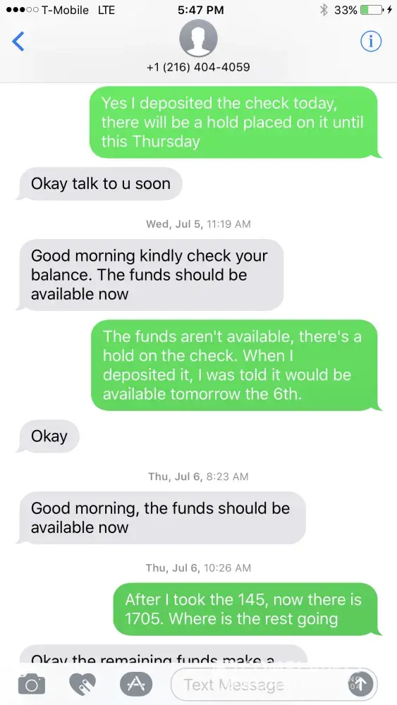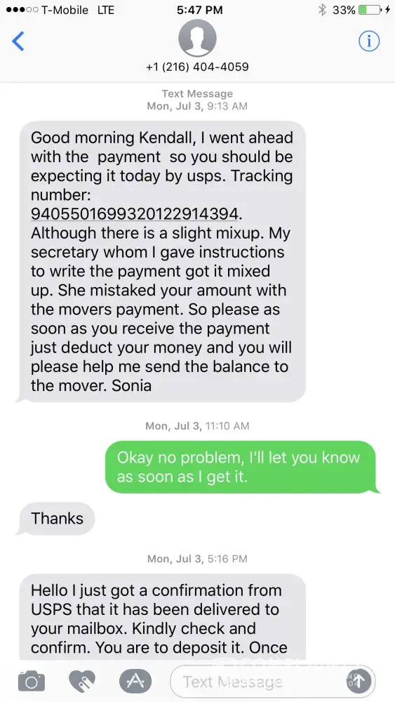 Conducted business w/ Sonia Khos who was actually named Nkesi Teniola to sell her a tv. She sent a check that was "accidentally" much more than the price of the tv. She told me to deposit check in my account and wait for the funds to be available so that I can make a cash deposit of the difference of the check and tv into her account. Once I did that, the check bounced in my account leaving me -$1805 and leaving her with a cash deposit of the money. I was told by both banks nothing could be done so I went to the police. The police wanted me to show them the messages from letgo app but when I checked back, the buyer's profile was pending moderation and the conversation was not visible. Please help. Just need the message thread.