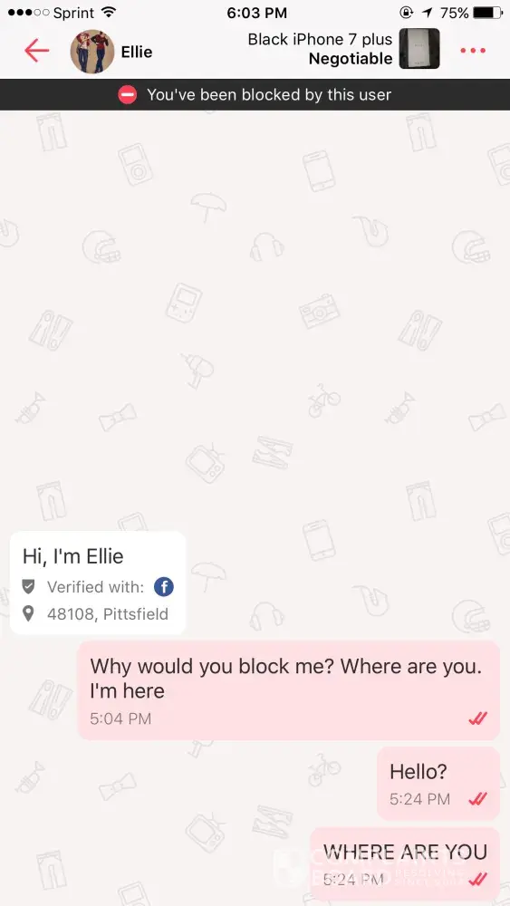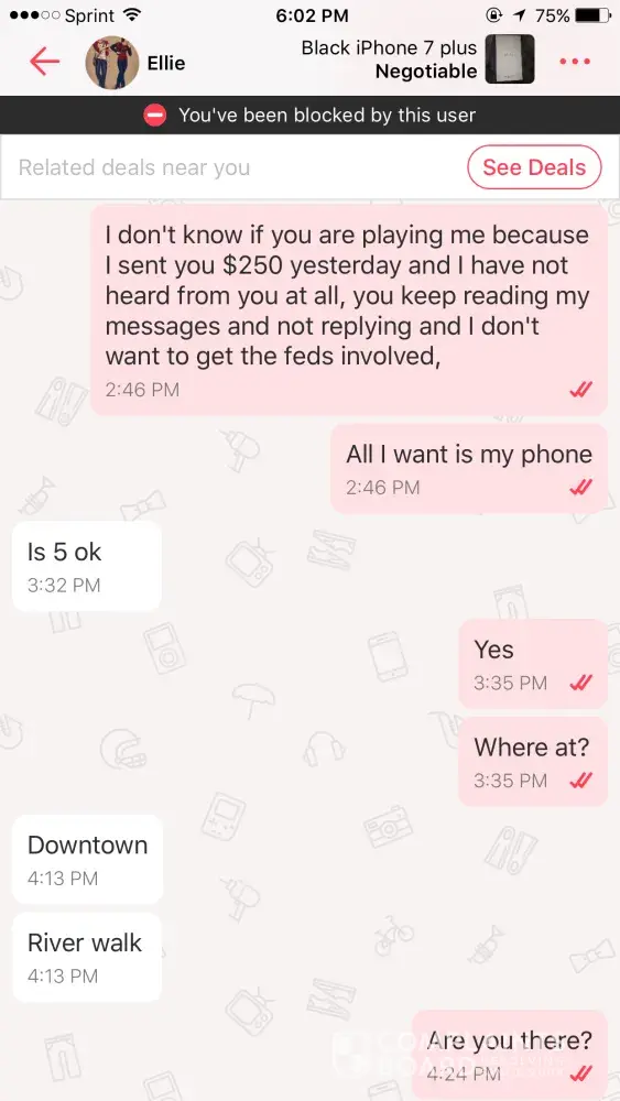 This person named Ellie was selling a iPhone 7plus .We agreed on a offer of $250 and I told her that meeting up would be better because I will have trouble trusting you and she said only if I send her the money via cash app. I did and we were suppose to meet at the river walk downtown Detroit and she never showed up and blocked me twice on letgo. The first time I was at the river walk waiting is when she blocked me. The second time when I kept asking her where is she and why she blocked me. Please help! I want my money back asap