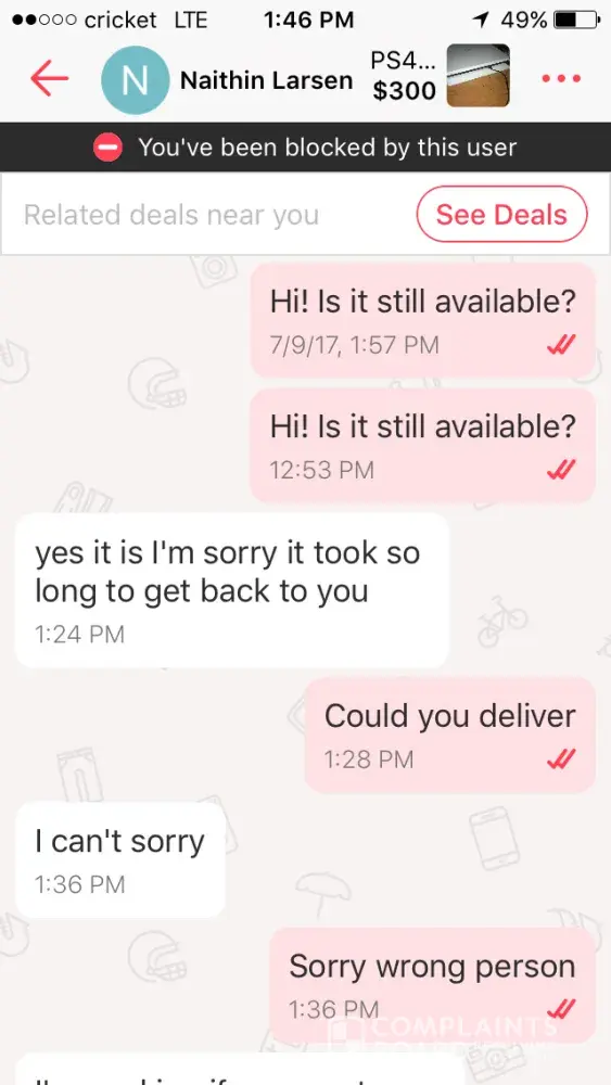 I was contacted about an item I had posted, they showed interest in the item so when they ask for my address I gave it to them because I had just had a yard sale and was trying to get rid of everything a few minutes later they responded saying that they were outside but when I went out side to check they were not there so I told them I did not see them and then they responded in a very disrespectful manner. Then they proceed to block me