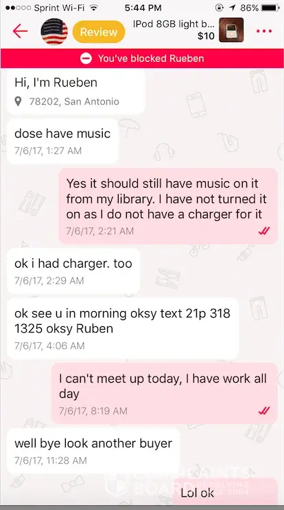 on July 11th 2017, I was communicating with a potential buyer and he wanted to meet halfway to purchase a $10 item. I told him that I was not willing to drive that far since its such a small payment. He then proceeded to block me and negatively review me saying untrustworthy and unfair prices. This behavior is unjustifiable and the negative review he gave me is simply out of frustration.