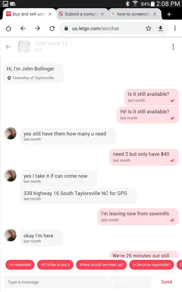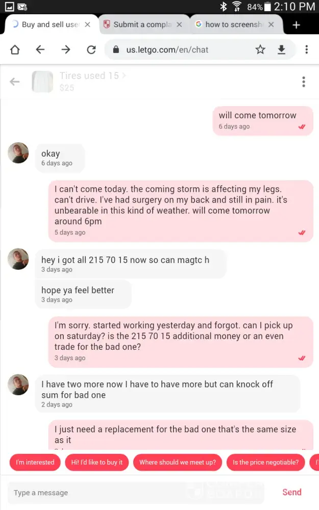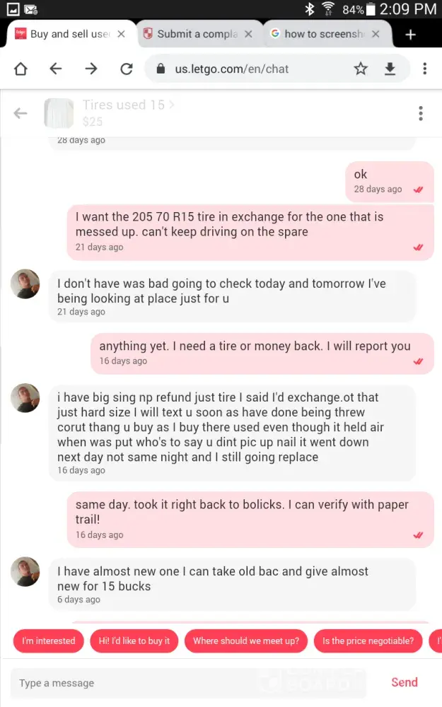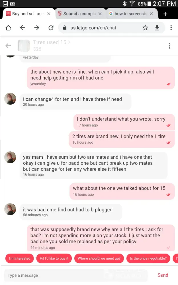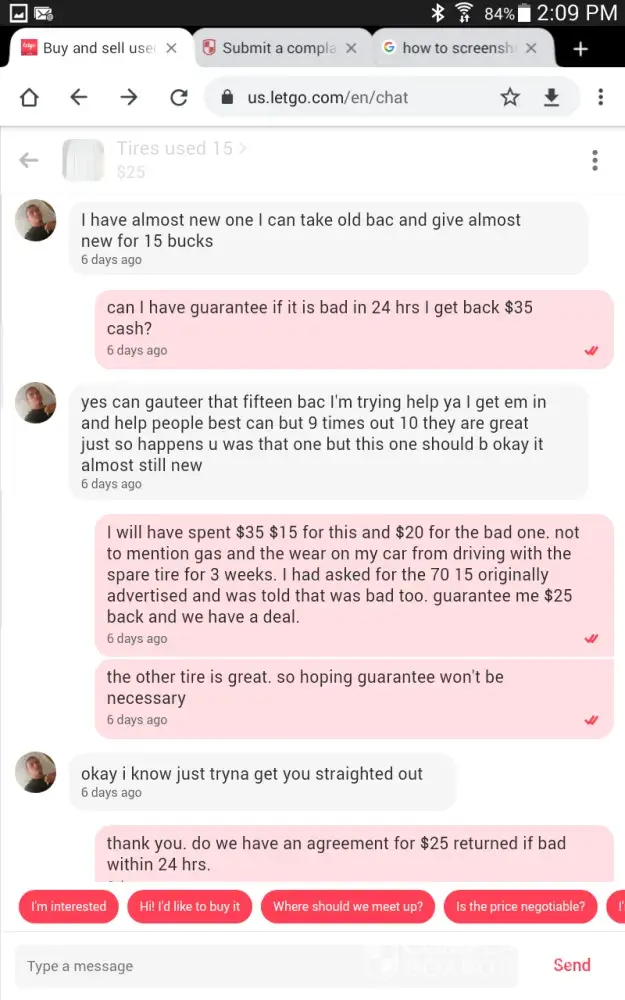 Please see my chat with John bollinger. He is selling used tires that are bad. You can see on the chat the tires I requested to replace the bad one he sold me. All of them were bad according to him. He won't return my money and keeps trying to sell me more tires instead of replacing the defective one he sold me as per his policy.