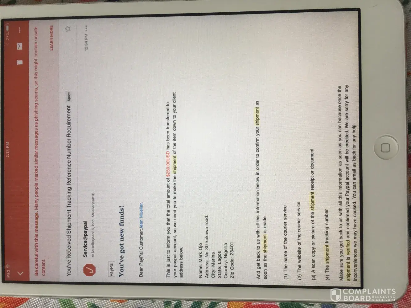 Fraudulent activity.Answered my ad for IPad mini 2.Said he wished to buy my IPad mini.Said he would uses PayPal, got email from "PayPal"checked and it was fraudulent.I was selling an IPad mini and he contacted me about buying it for his girlfriend.He told me to check my spam email for a confirmation that a payment would be sent to my PayPal account once I had contacted him about the shipping information.When I told him I had contacted PayPal who said no such email had been sent, he swore and hung up.